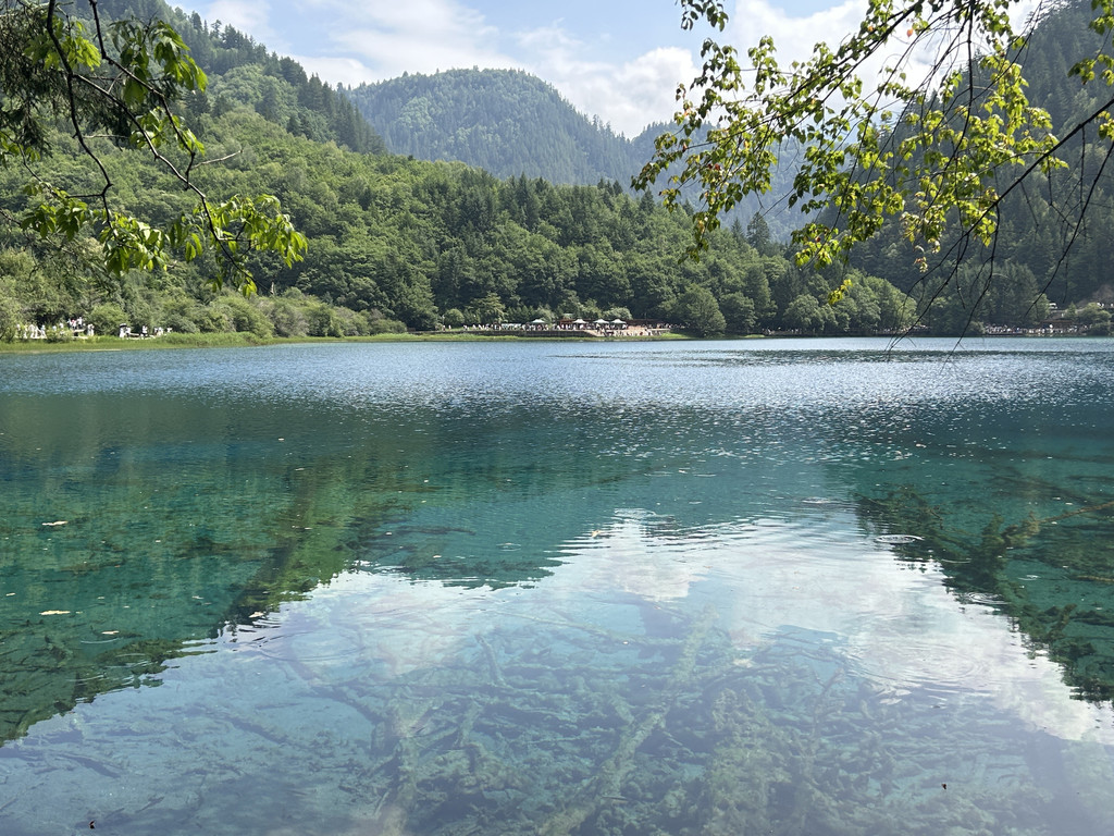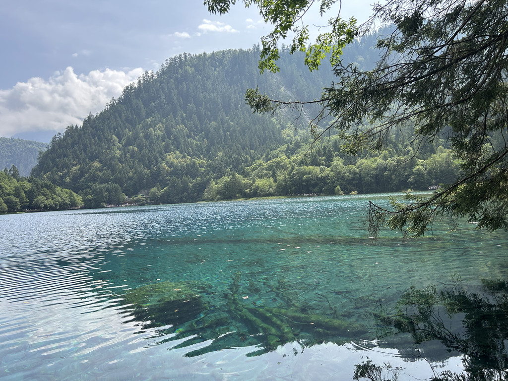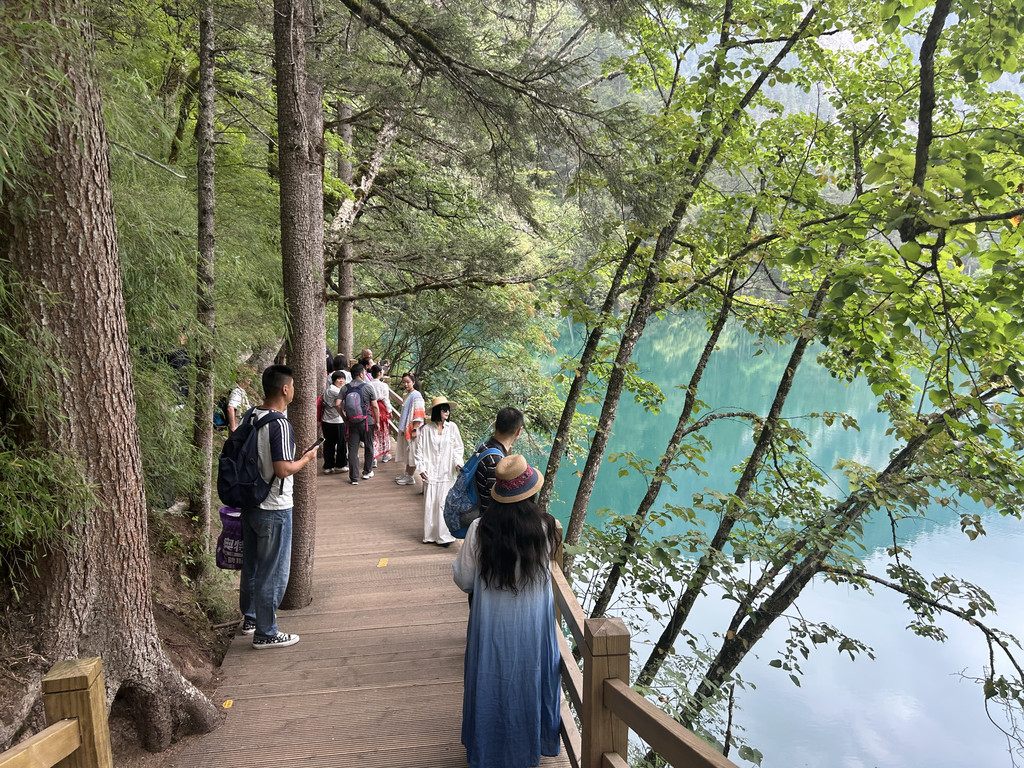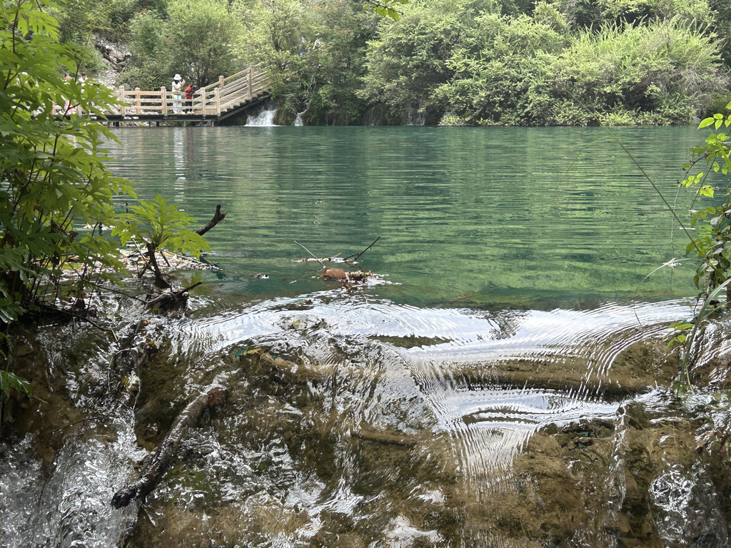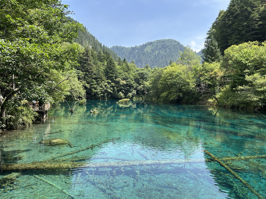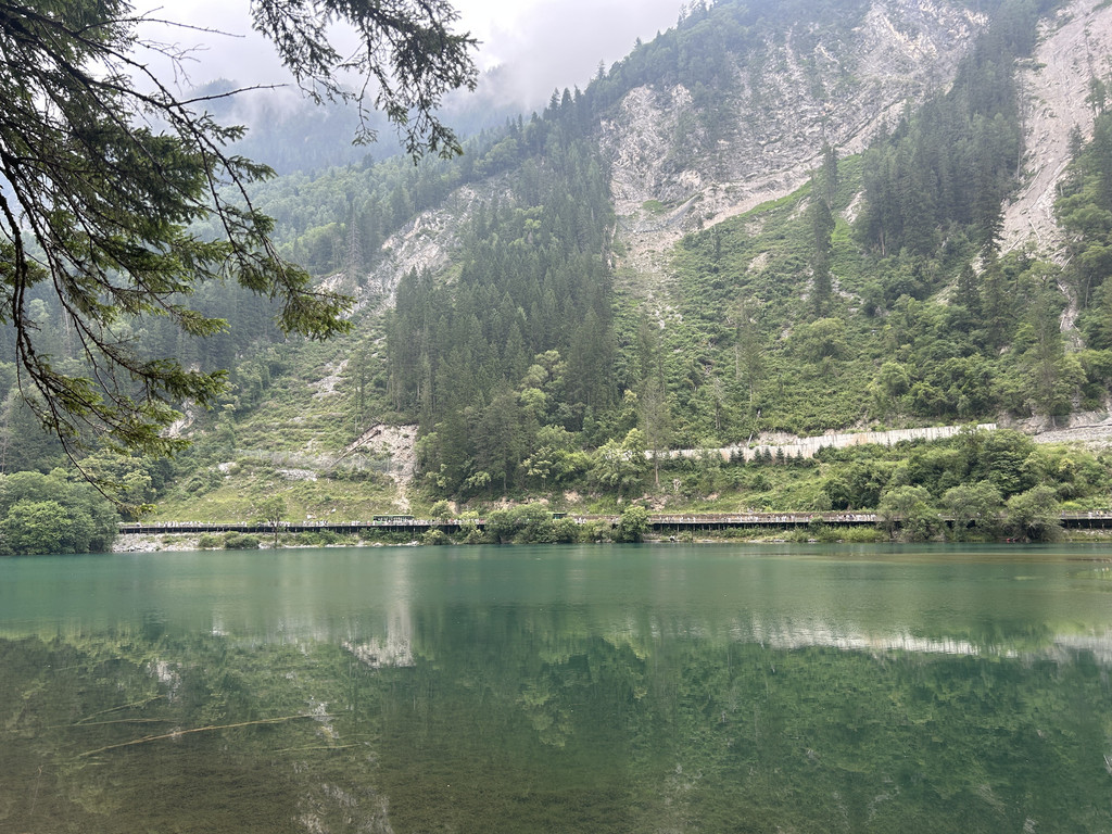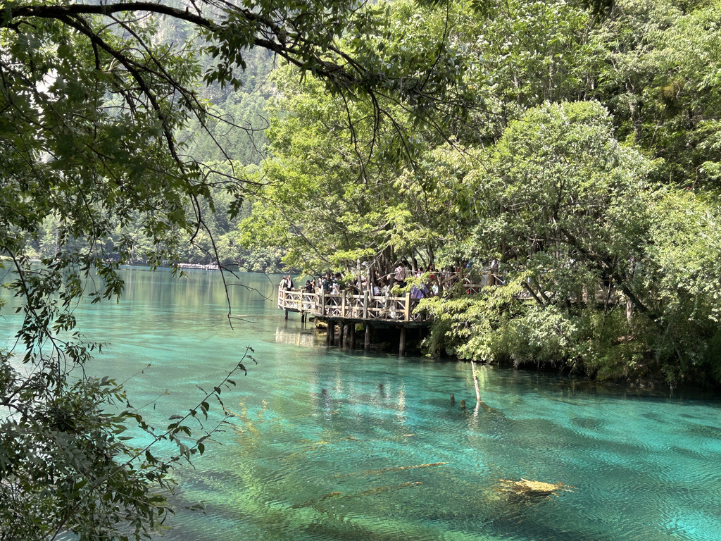 在木板栈道上细看,四周山色树木,无一遗漏地倒映其中,水非常的冰凉、清澈,而且都是呈现绿蓝色的,近岸处是透明的浅绿,渐次加深为翡翠色、蓝绿色,至湖心则成了深不可测的湛蓝。水面上偶尔有落叶飘下,打着旋儿,慢慢沉向水底那些钙化的枯树。这些树已经躺了数十年,甚至上百年,依然保持着沉没时的姿态,不腐不烂,成了水底的一座雕塑园。