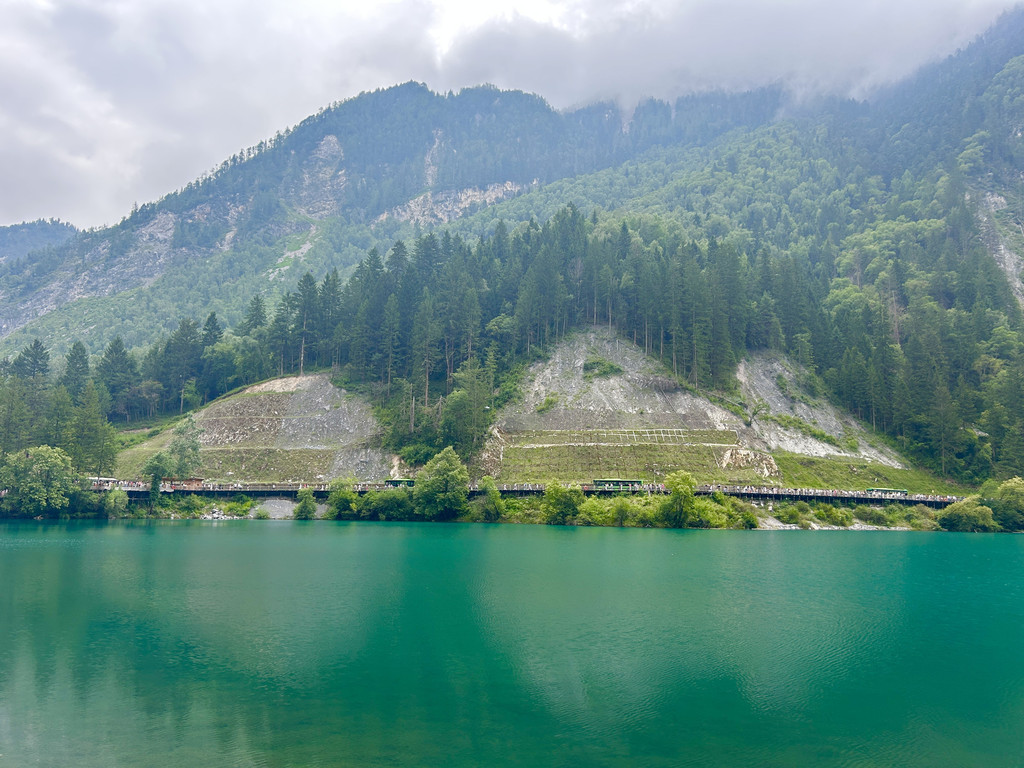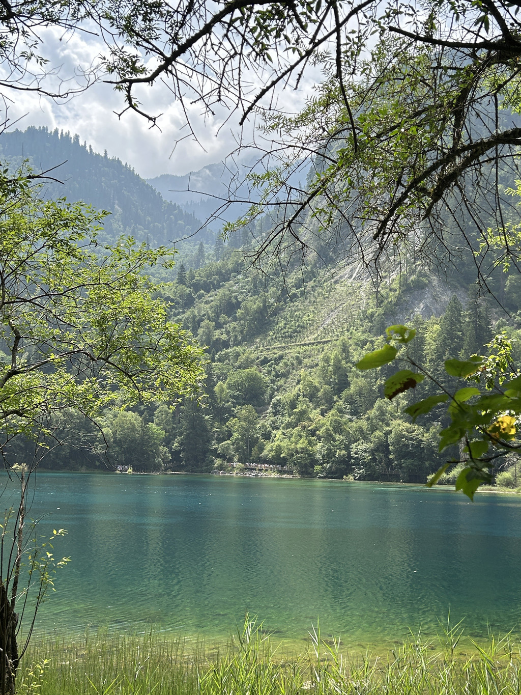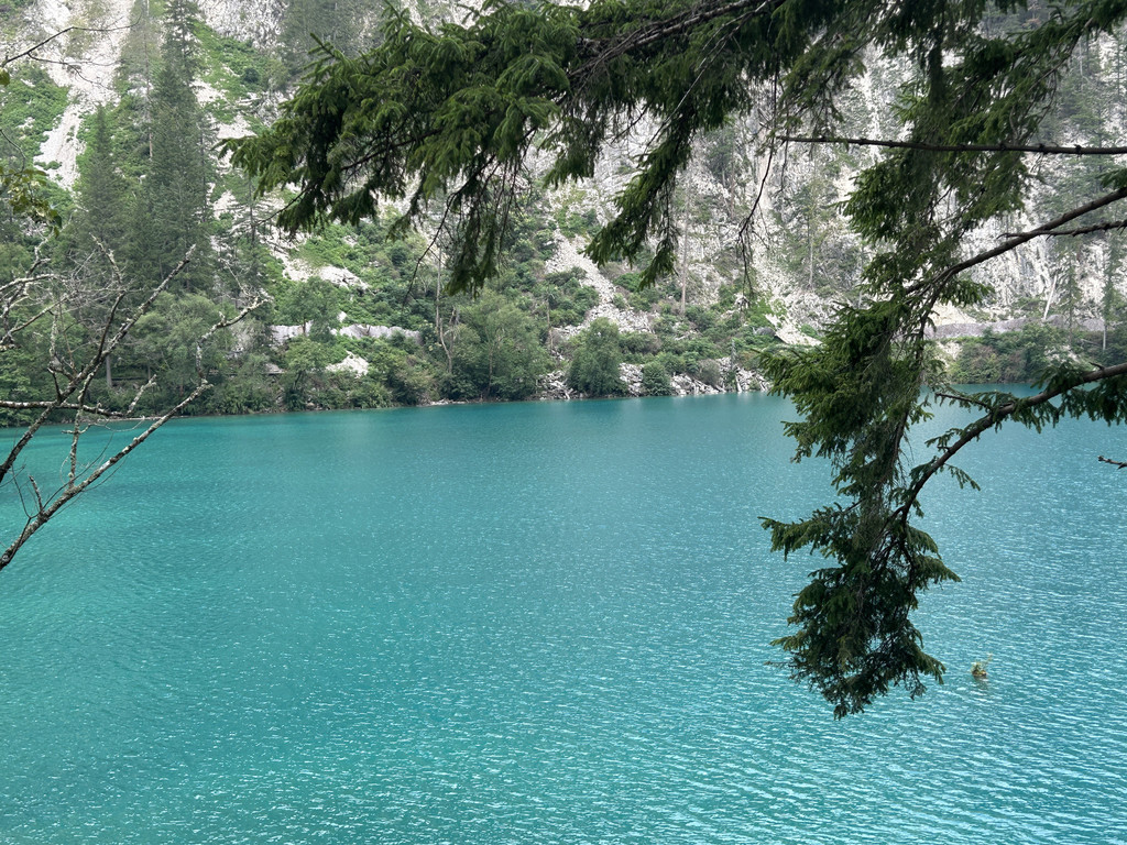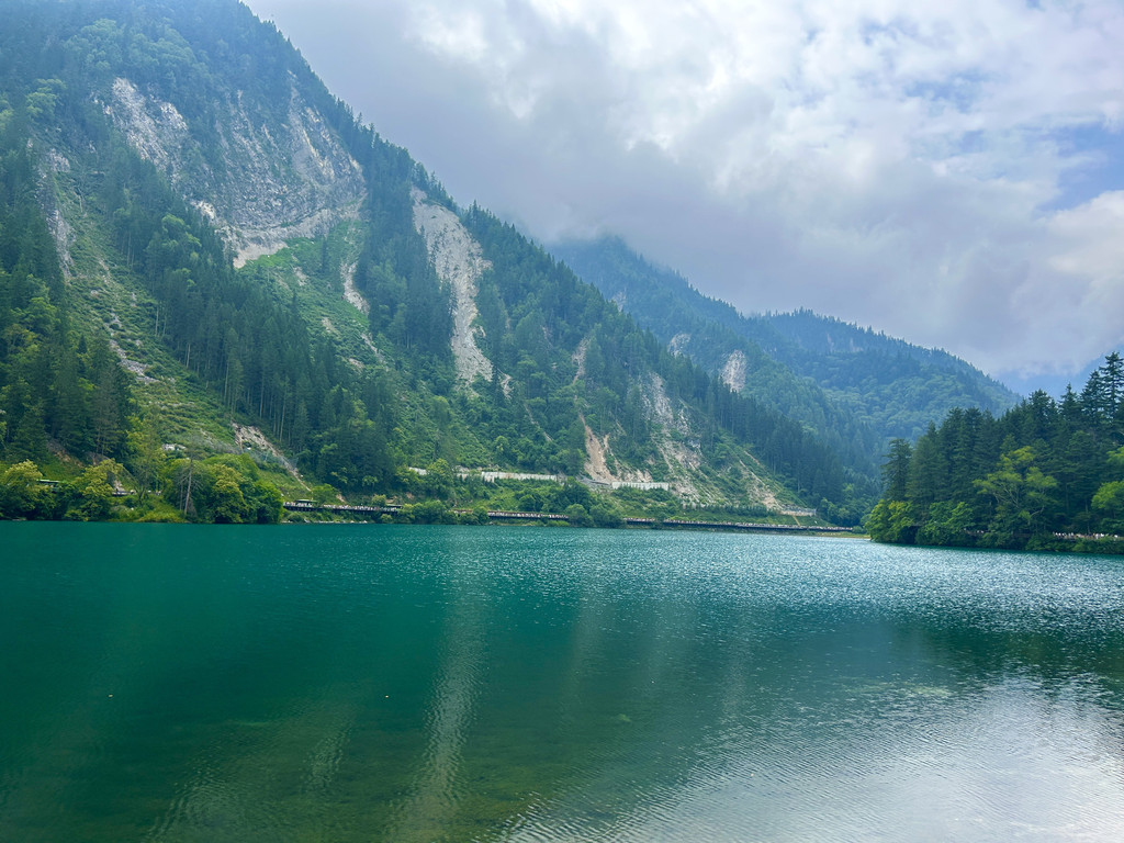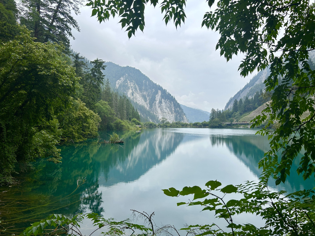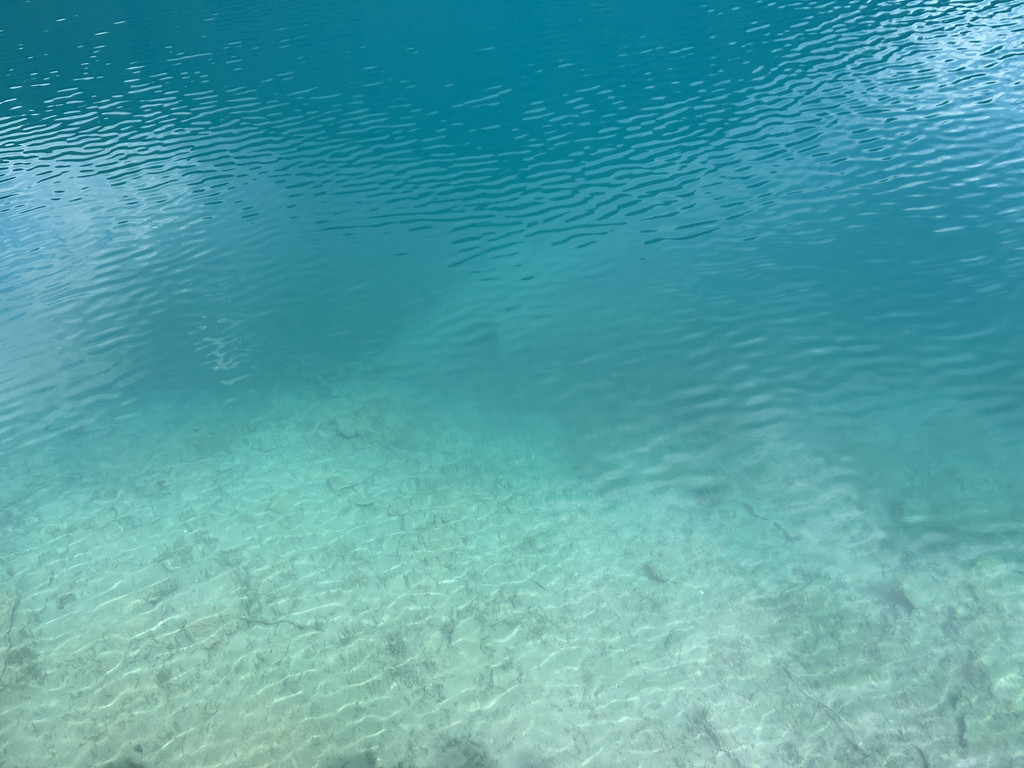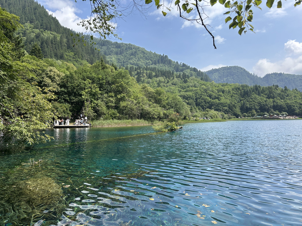 在木板栈道上细看,四周山色树木,无一遗漏地倒映其中,水非常的冰凉、清澈,而且都是呈现绿蓝色的,近岸处是透明的浅绿,渐次加深为翡翠色、蓝绿色,至湖心则成了深不可测的湛蓝。水面上偶尔有落叶飘下,打着旋儿,慢慢沉向水底那些钙化的枯树。这些树已经躺了数十年,甚至上百年,依然保持着沉没时的姿态,不腐不烂,成了水底的一座雕塑园。