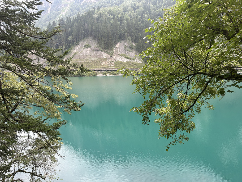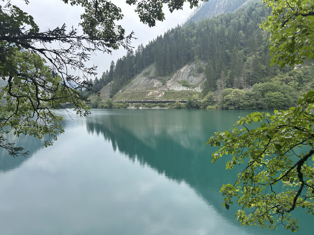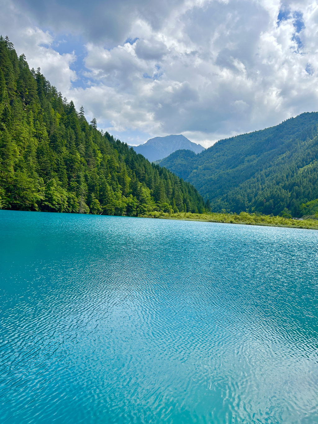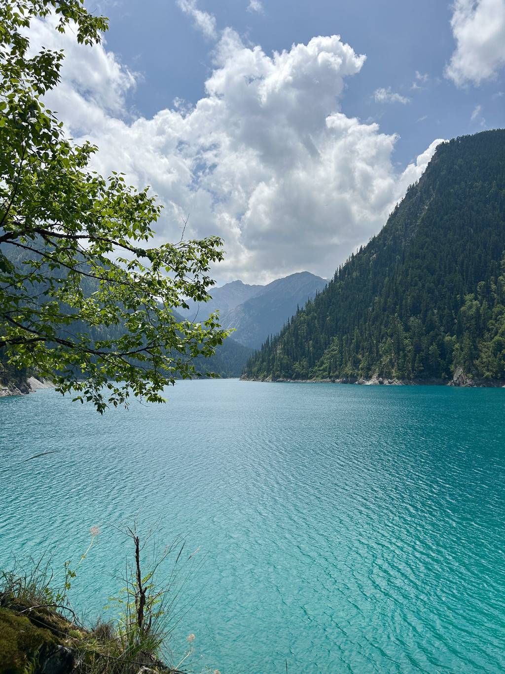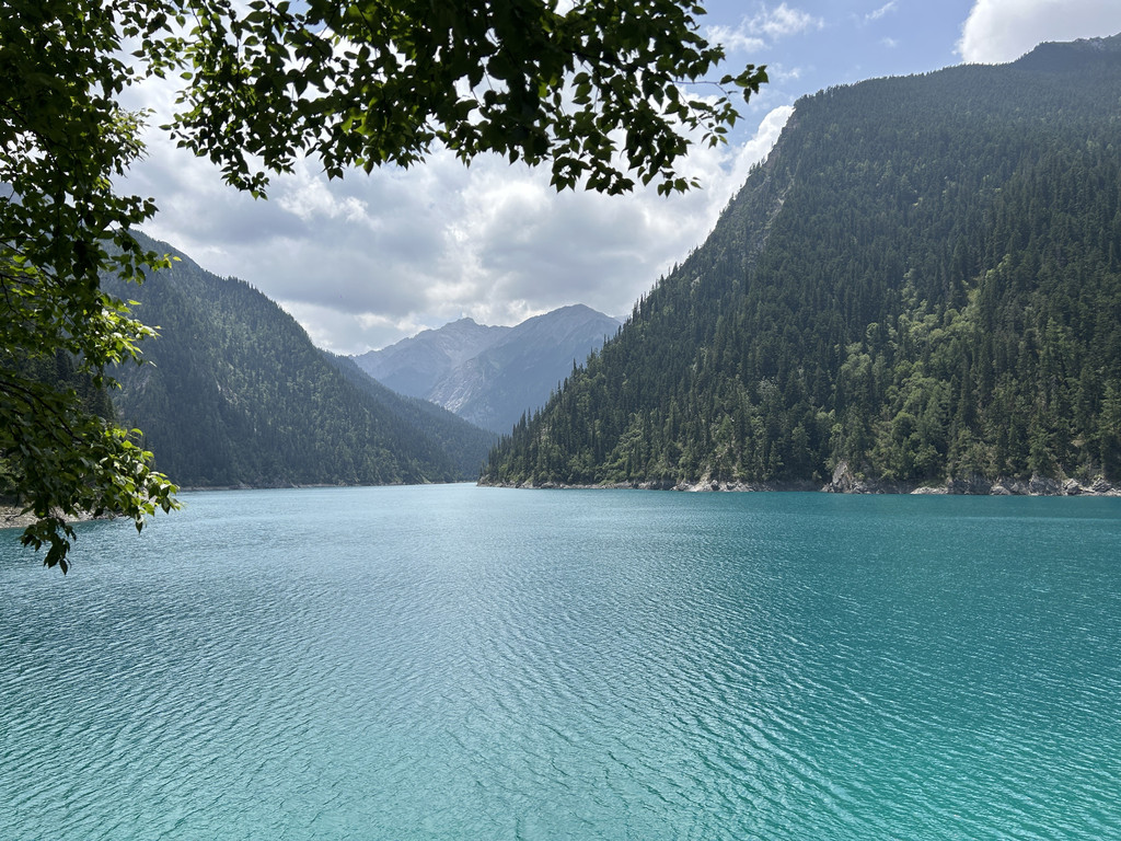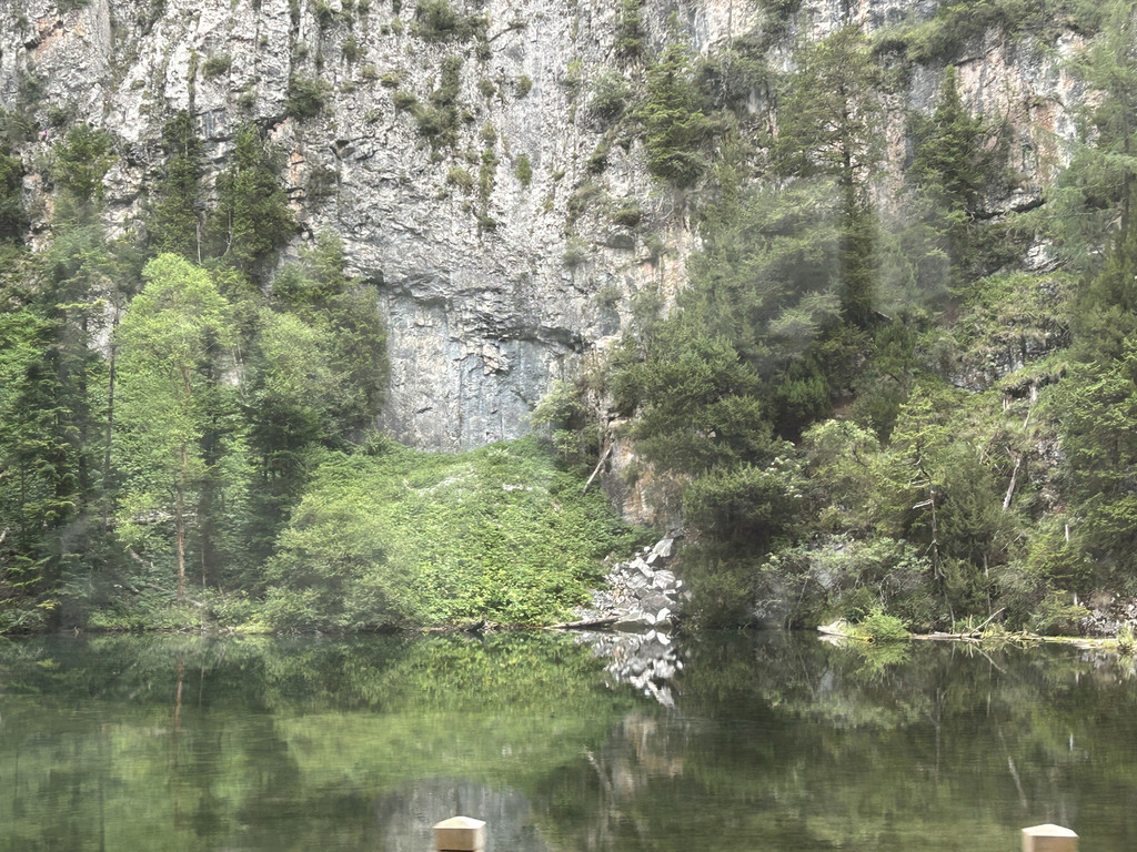 在木板栈道上细看,四周山色树木,无一遗漏地倒映其中,水非常的冰凉、清澈,而且都是呈现绿蓝色的,近岸处是透明的浅绿,渐次加深为翡翠色、蓝绿色,至湖心则成了深不可测的湛蓝。水面上偶尔有落叶飘下,打着旋儿,慢慢沉向水底那些钙化的枯树。这些树已经躺了数十年,甚至上百年,依然保持着沉没时的姿态,不腐不烂,成了水底的一座雕塑园。