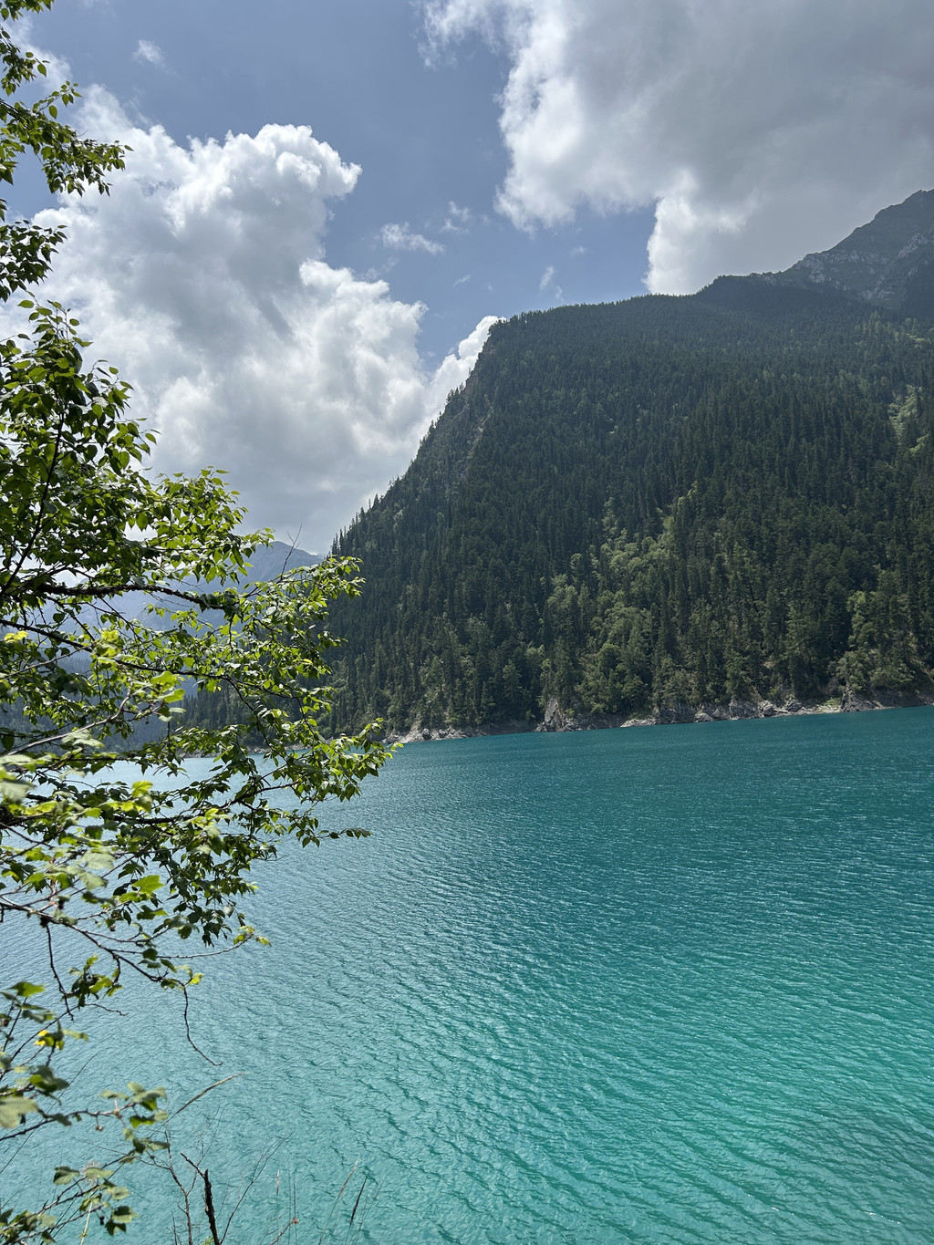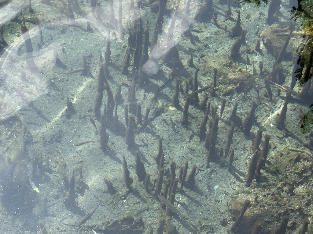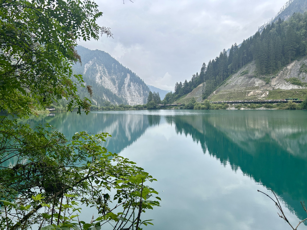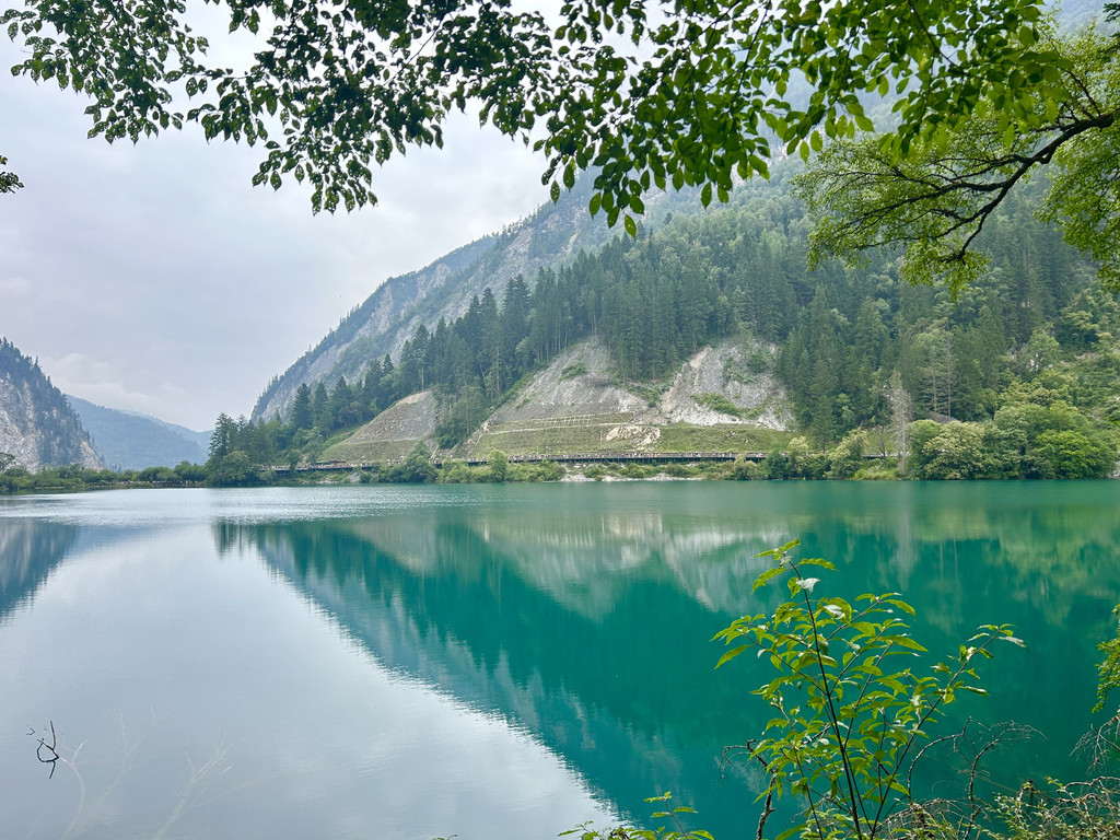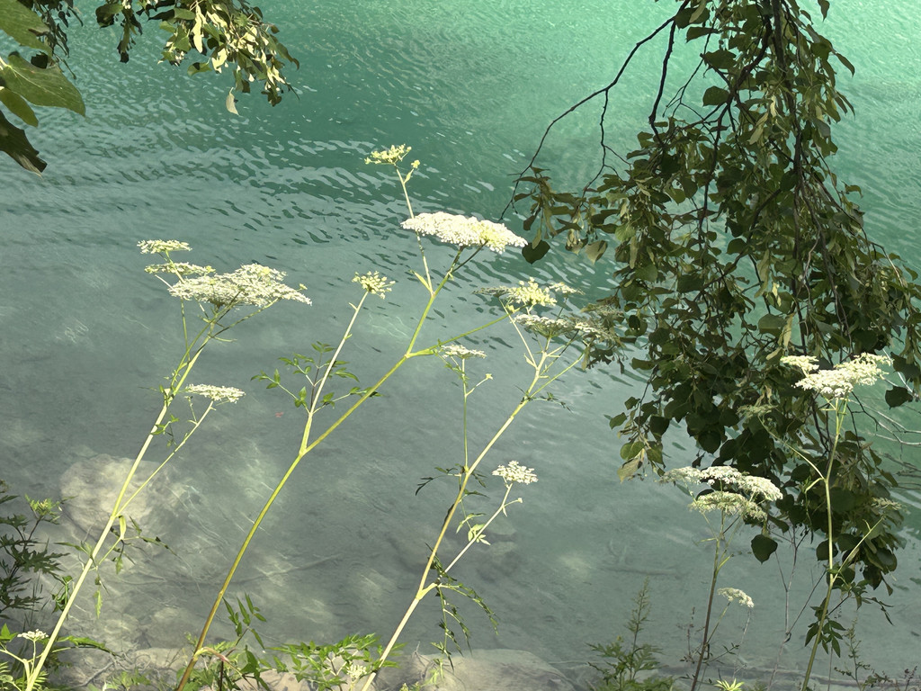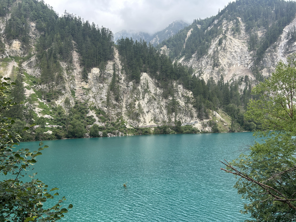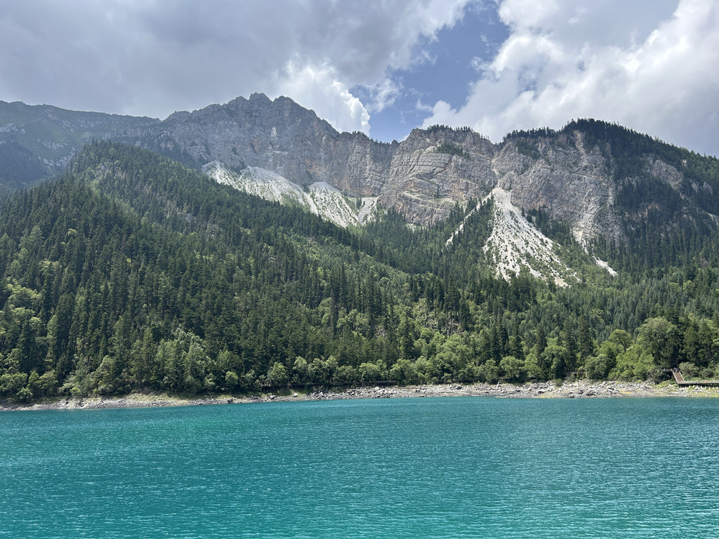 在木板栈道上细看,四周山色树木,无一遗漏地倒映其中,水非常的冰凉、清澈,而且都是呈现绿蓝色的,近岸处是透明的浅绿,渐次加深为翡翠色、蓝绿色,至湖心则成了深不可测的湛蓝。水面上偶尔有落叶飘下,打着旋儿,慢慢沉向水底那些钙化的枯树。这些树已经躺了数十年,甚至上百年,依然保持着沉没时的姿态,不腐不烂,成了水底的一座雕塑园。
