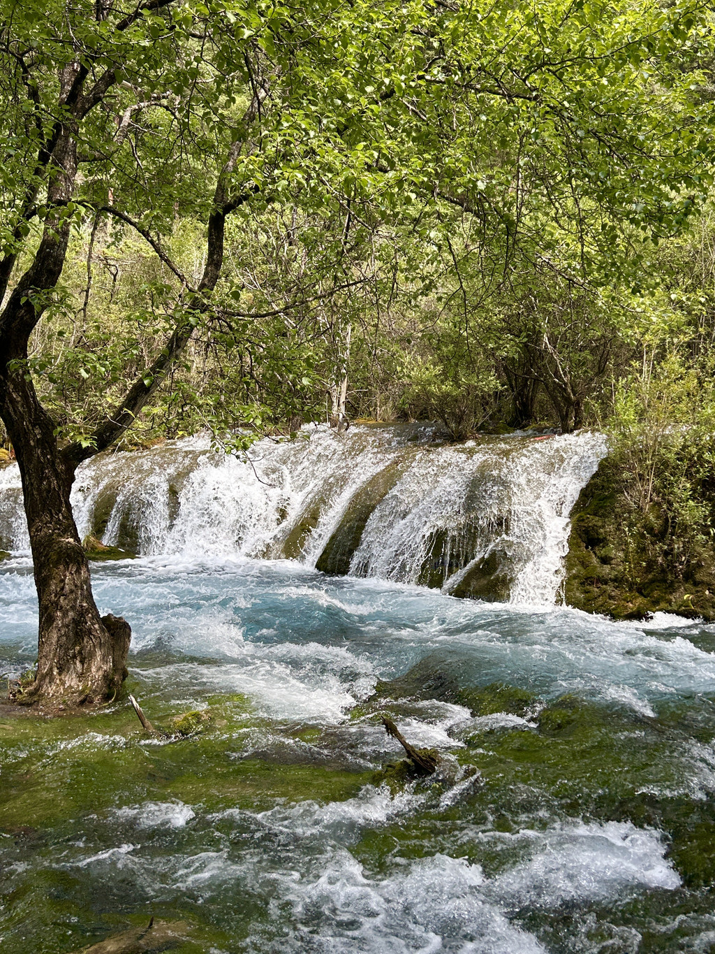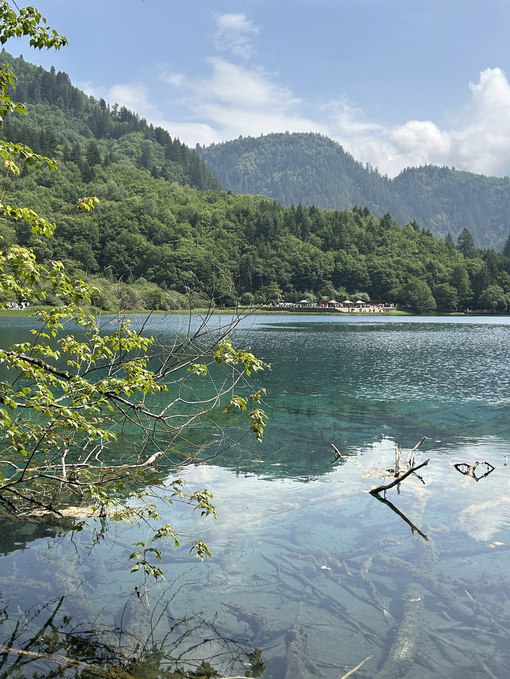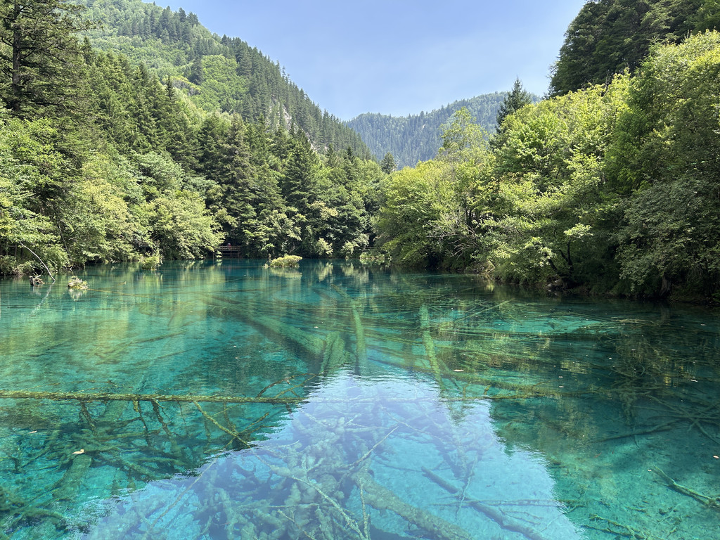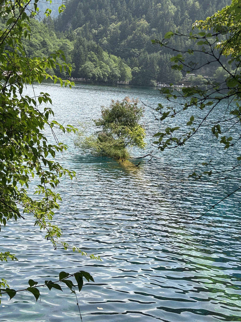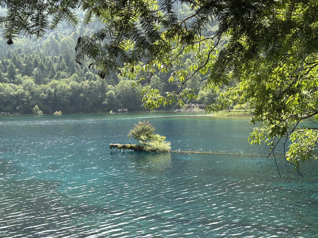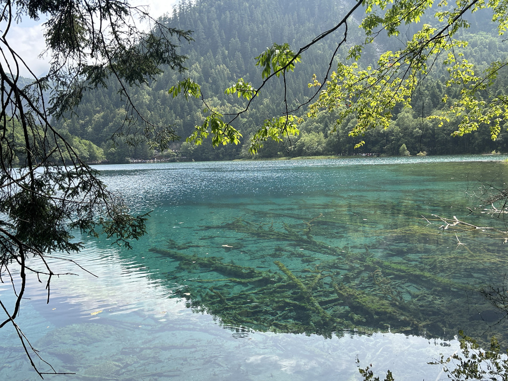 瀑布之下,便是树正群海。十余个海子相连,如翡翠项链般串在一起。海水极清,可见底下的枯树枝桠,横斜交错,经年累月,已披上乳黄色的钙华沉积。行至高处回望,树正群海尽收眼底。海水因深浅不同、沉积物各异,呈现出蓝绿黄诸色,斑斓绚丽。