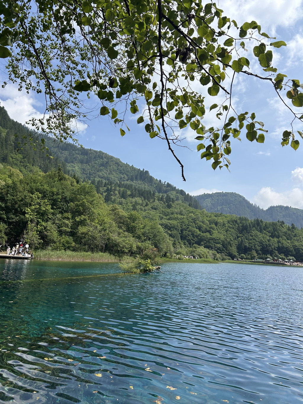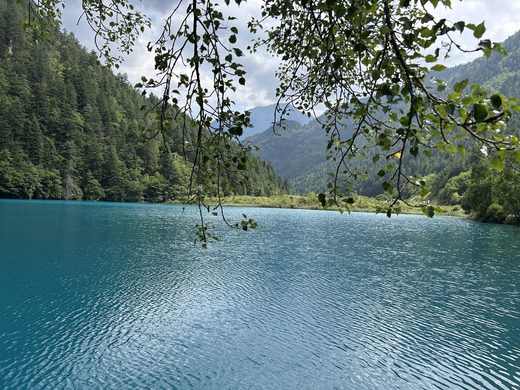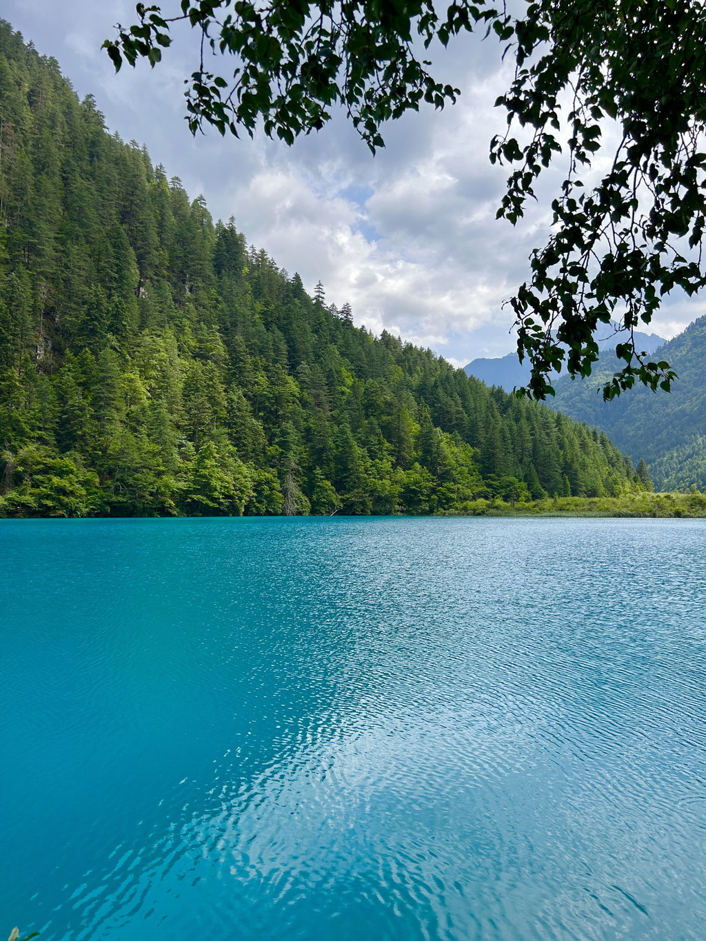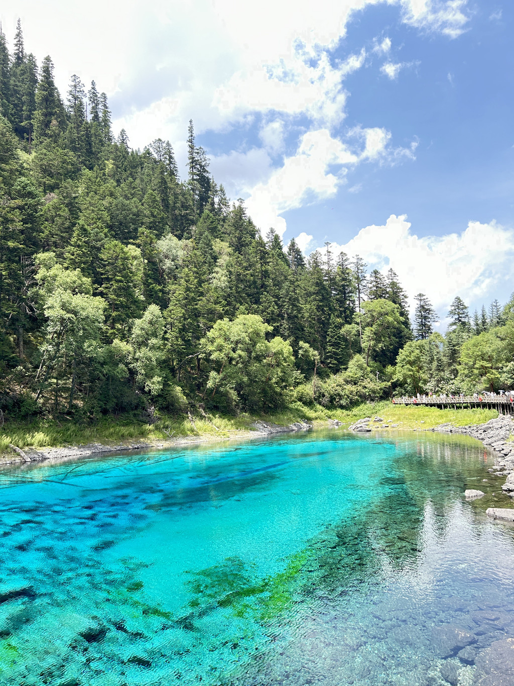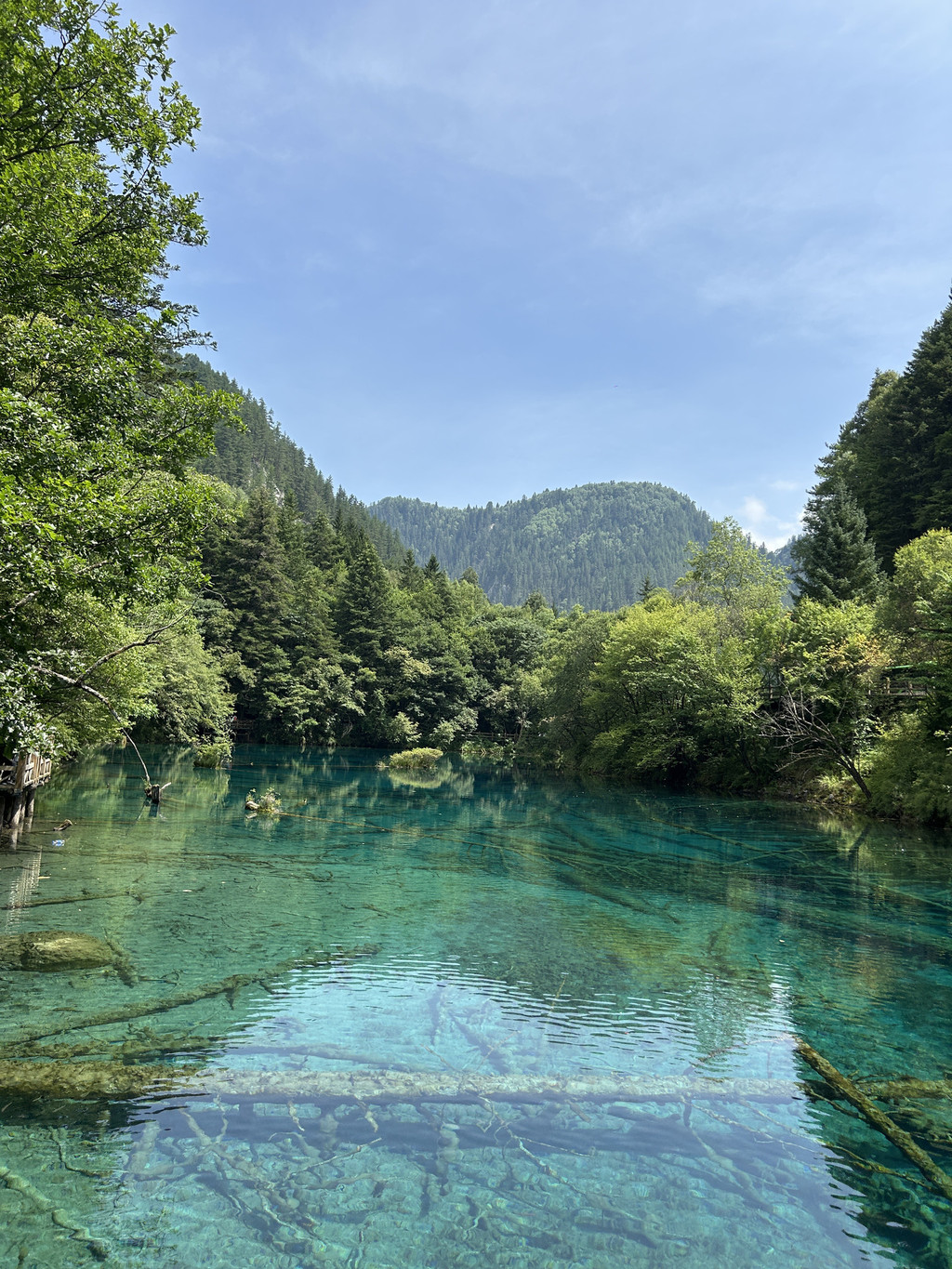 瀑布之下,便是树正群海。十余个海子相连,如翡翠项链般串在一起。海水极清,可见底下的枯树枝桠,横斜交错,经年累月,已披上乳黄色的钙华沉积。行至高处回望,树正群海尽收眼底。海水因深浅不同、沉积物各异,呈现出蓝绿黄诸色,斑斓绚丽。