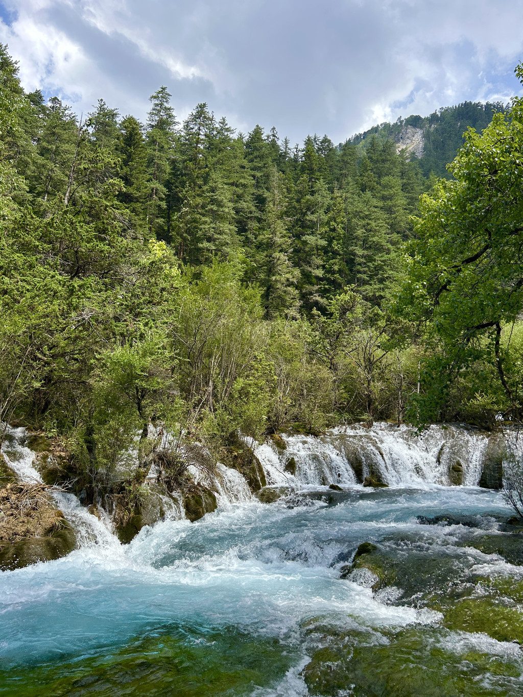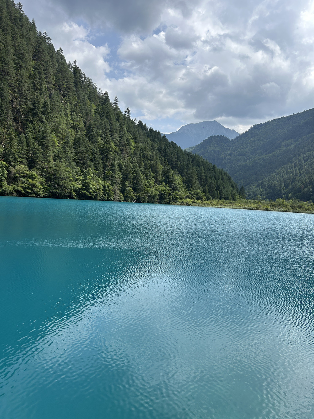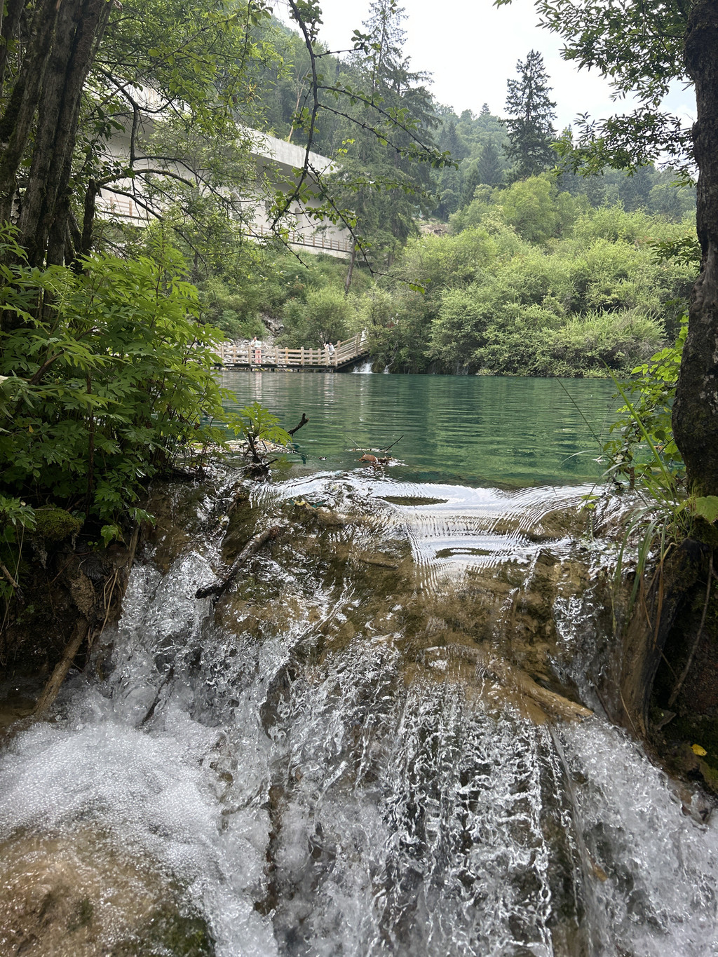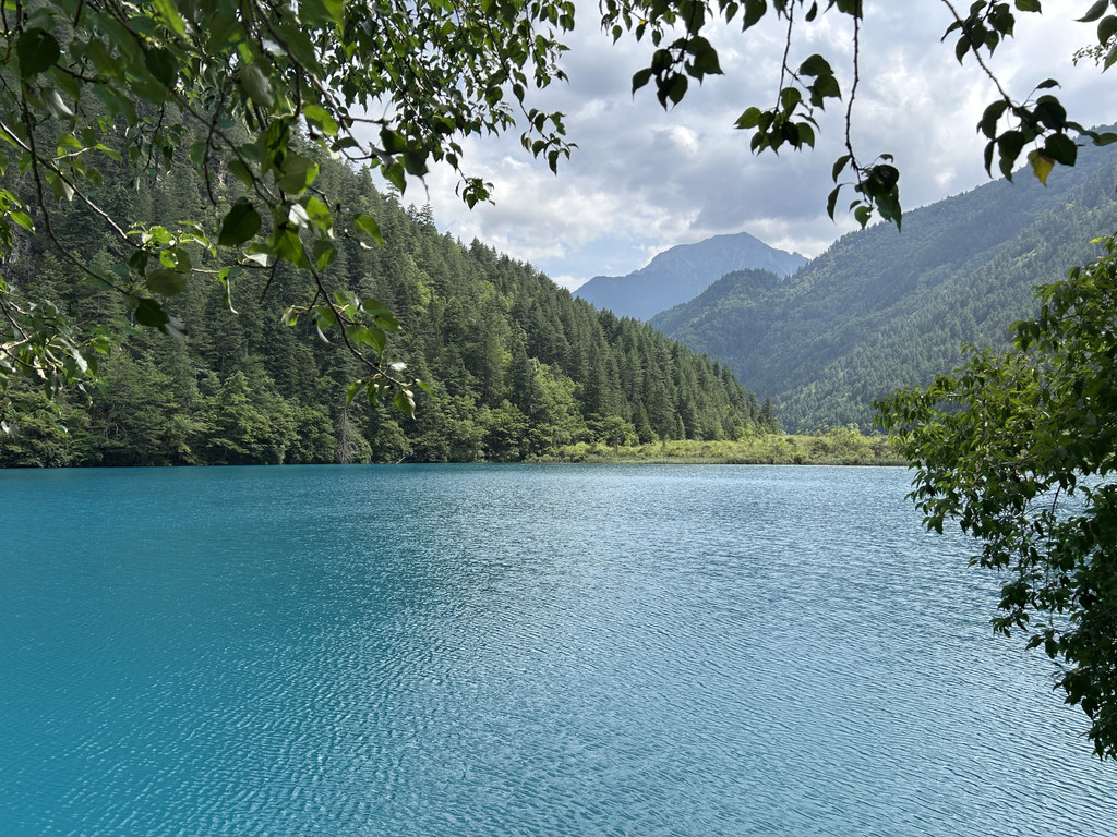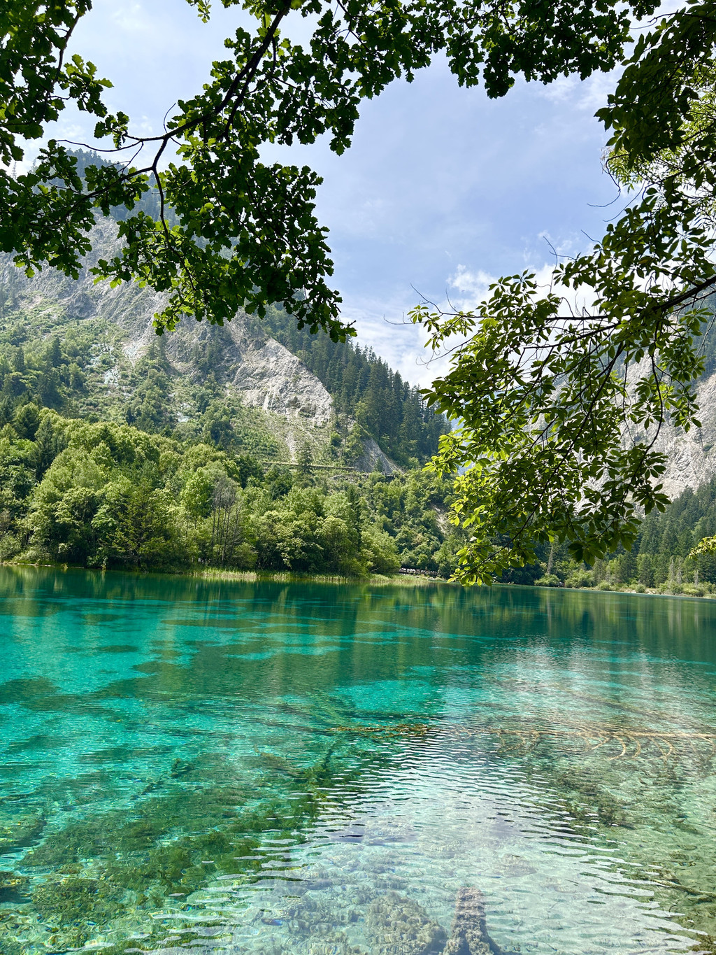 瀑布之下,便是树正群海。十余个海子相连,如翡翠项链般串在一起。海水极清,可见底下的枯树枝桠,横斜交错,经年累月,已披上乳黄色的钙华沉积。行至高处回望,树正群海尽收眼底。海水因深浅不同、沉积物各异,呈现出蓝绿黄诸色,斑斓绚丽。