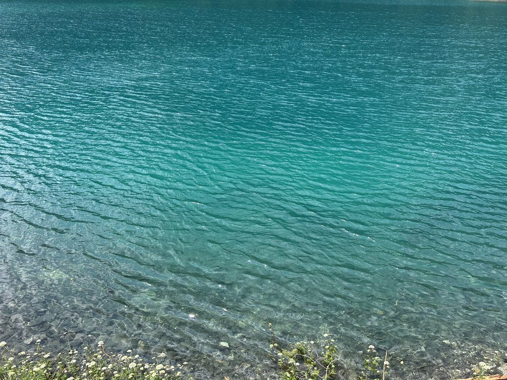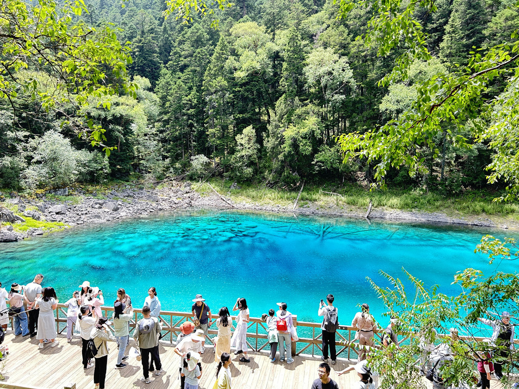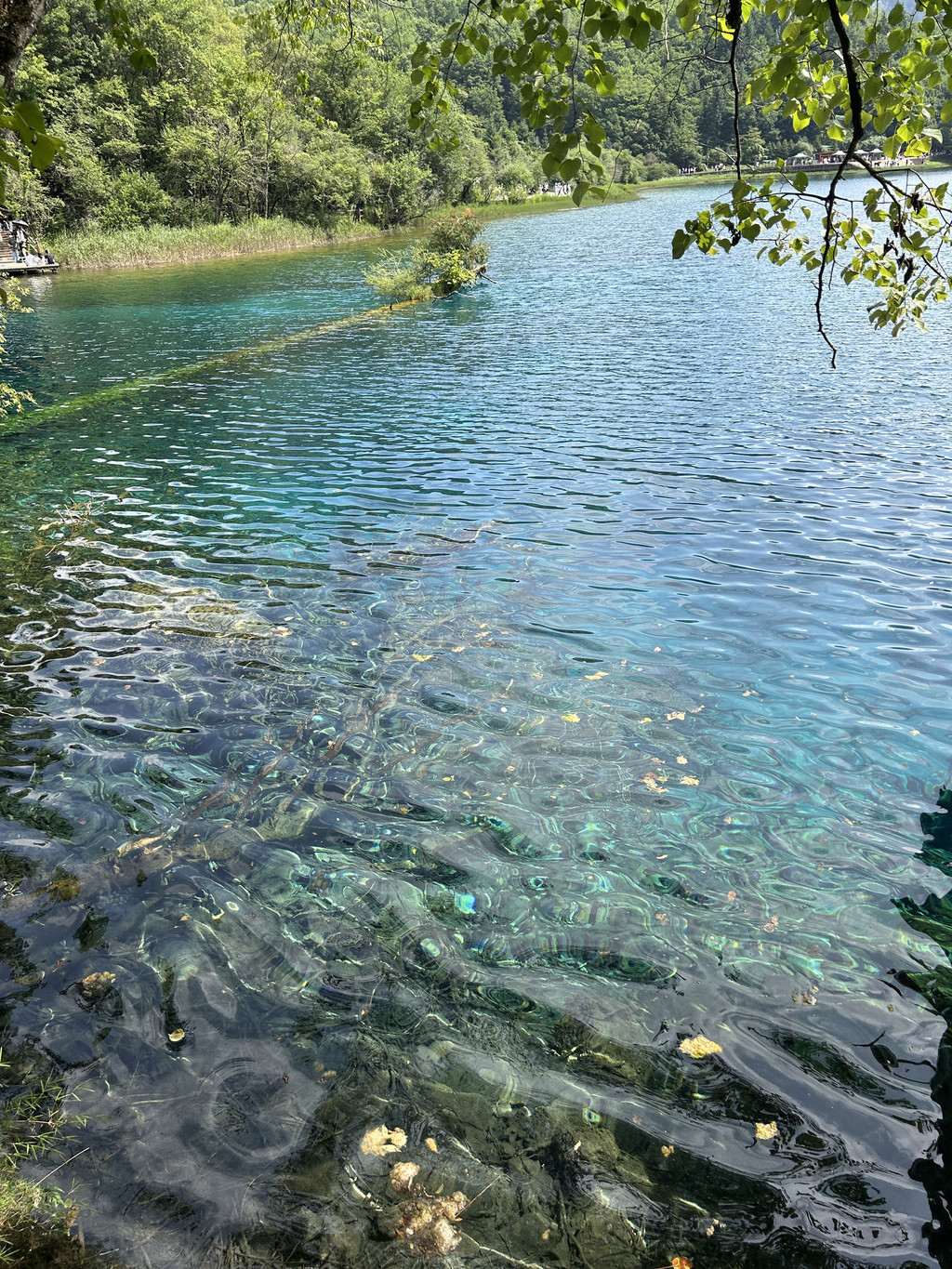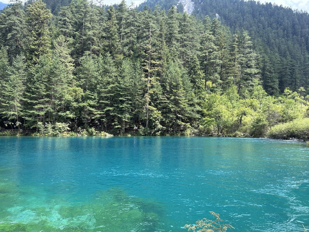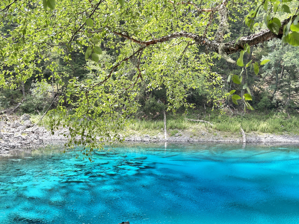观光车在五花海下车的人群如流水般沁入,湖水色彩奇极,蓝绿交错,清澈见底。水中枯木横斜,钙华沉积,经年累月,竟成了别样景致。阳光穿透水面,映出粼粼波光,恍惚间竟似有鱼儿游弋其间,细看却是水底石纹作怪。