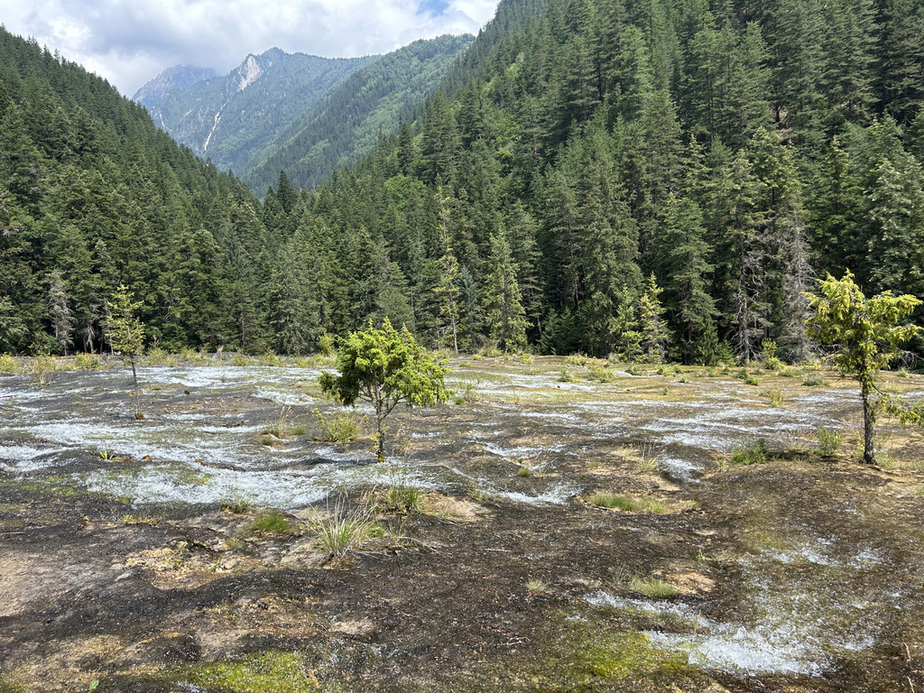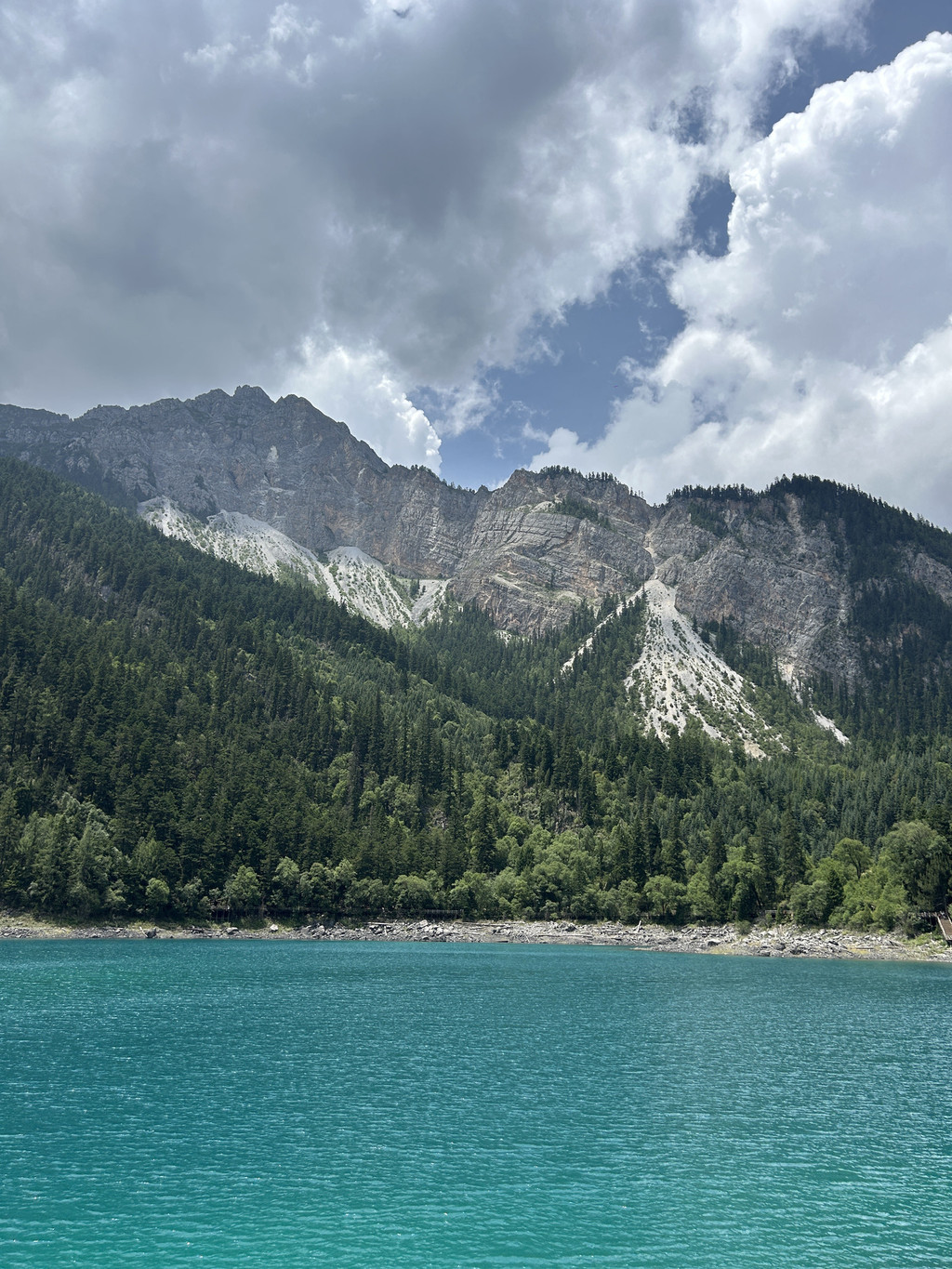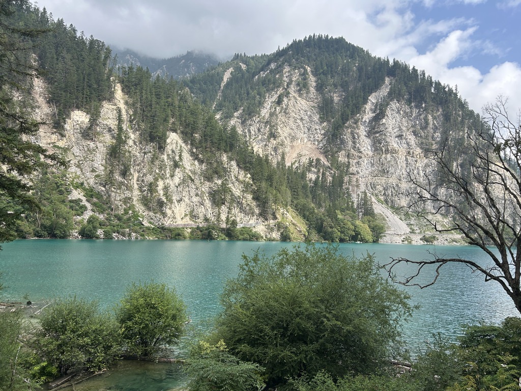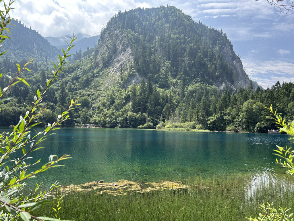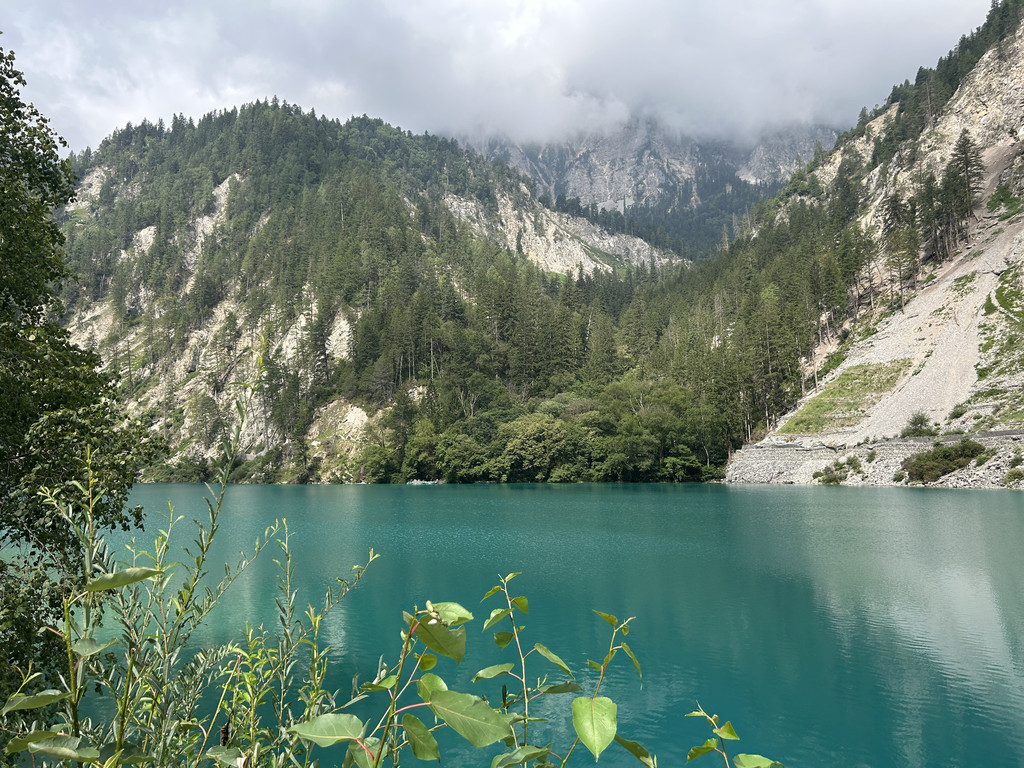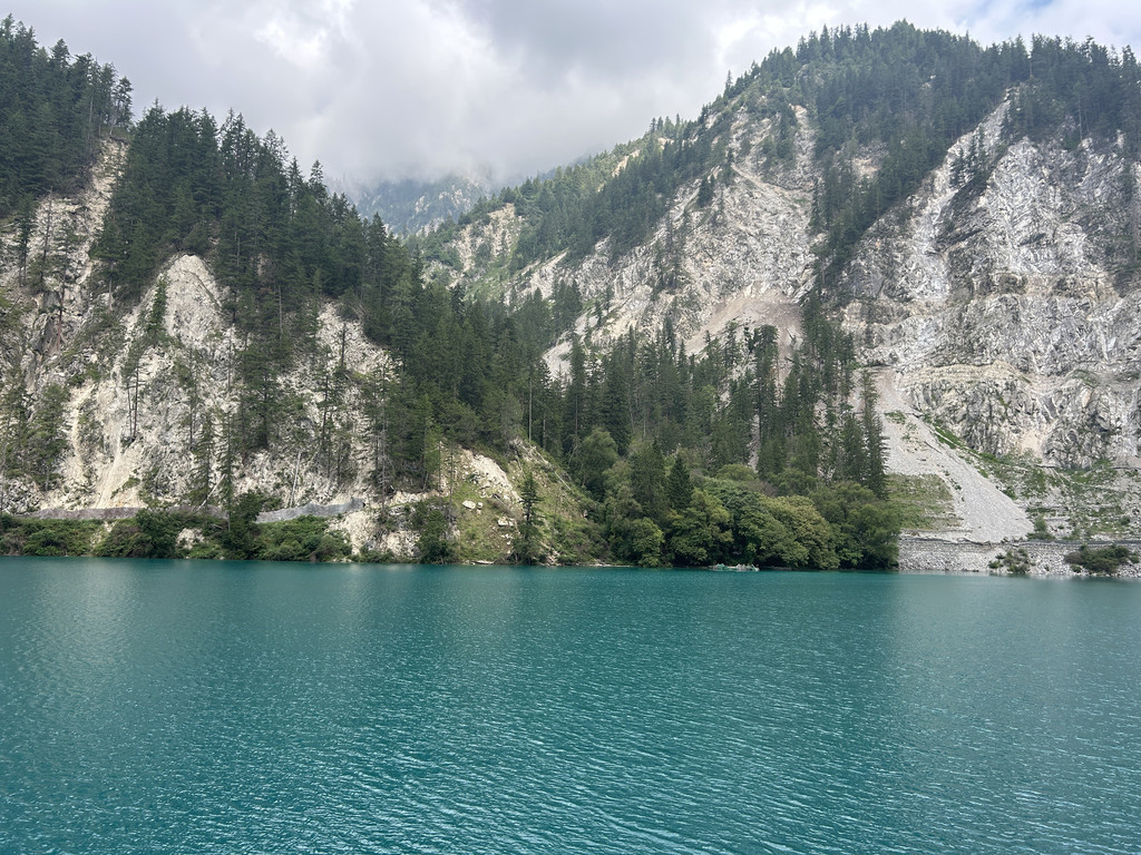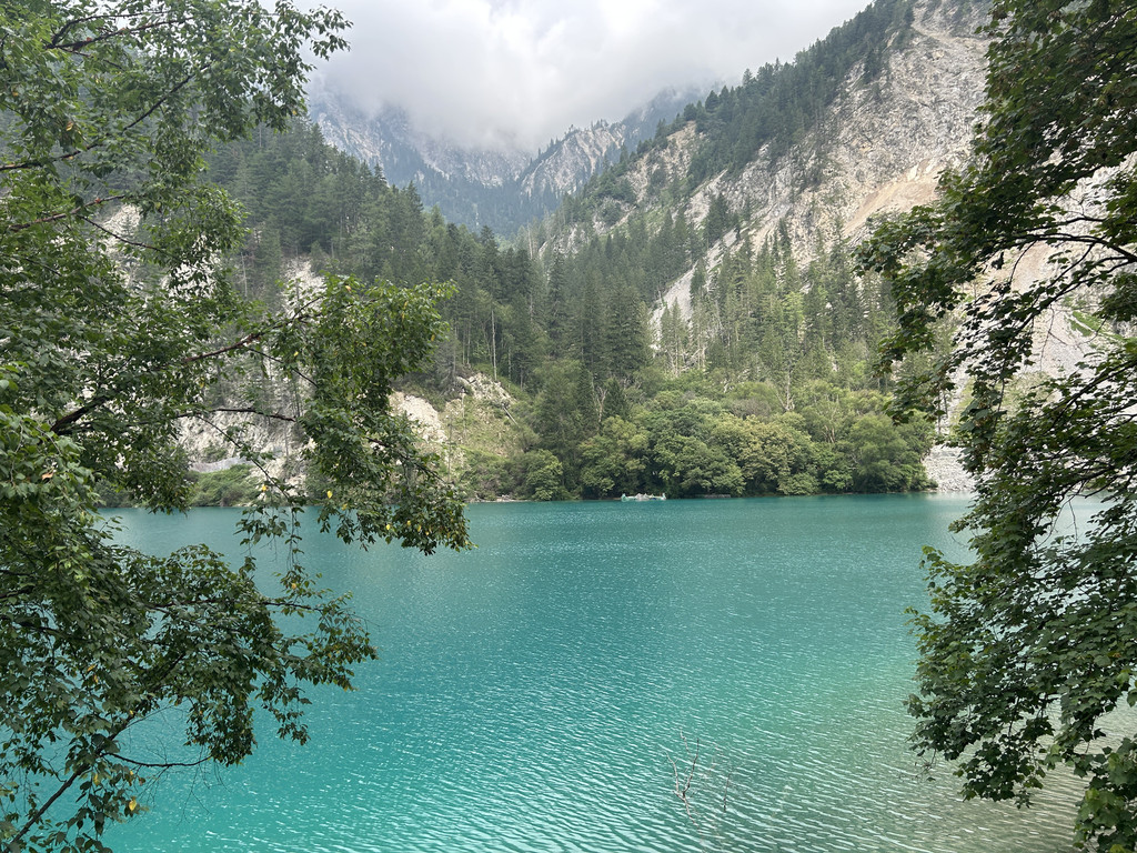 深谷之中,一片凹地,积了一汪水,乍看盈盈一碧,细看色彩斑斓。它更像神仙的调色盘,清澈见底的池水呈现出黄绿、靛蓝、祖母绿交织的斑斓色彩。当云朵飘过时,水面颜色又起了奇妙的变化,仿佛在演绎光影的魔术。