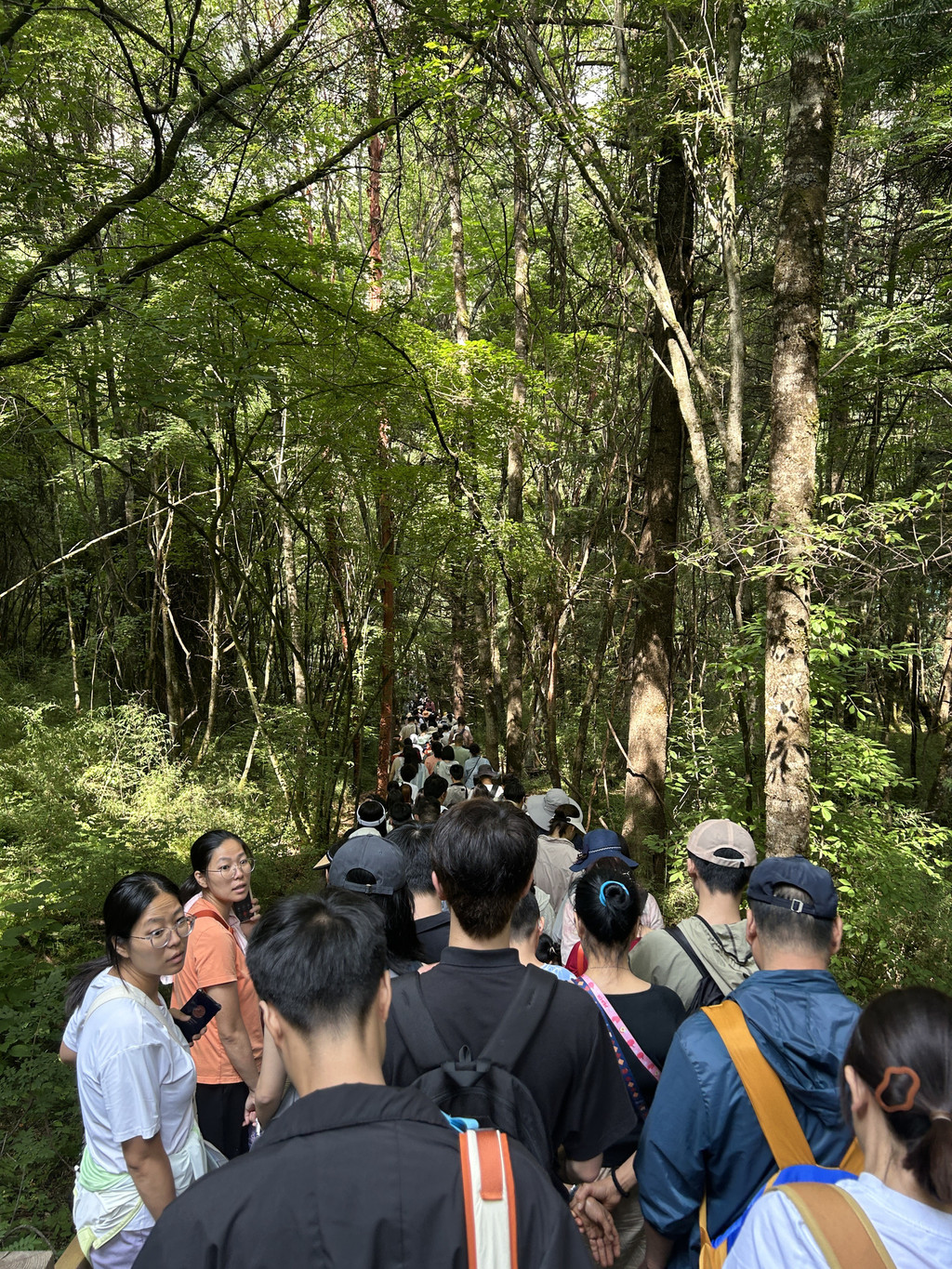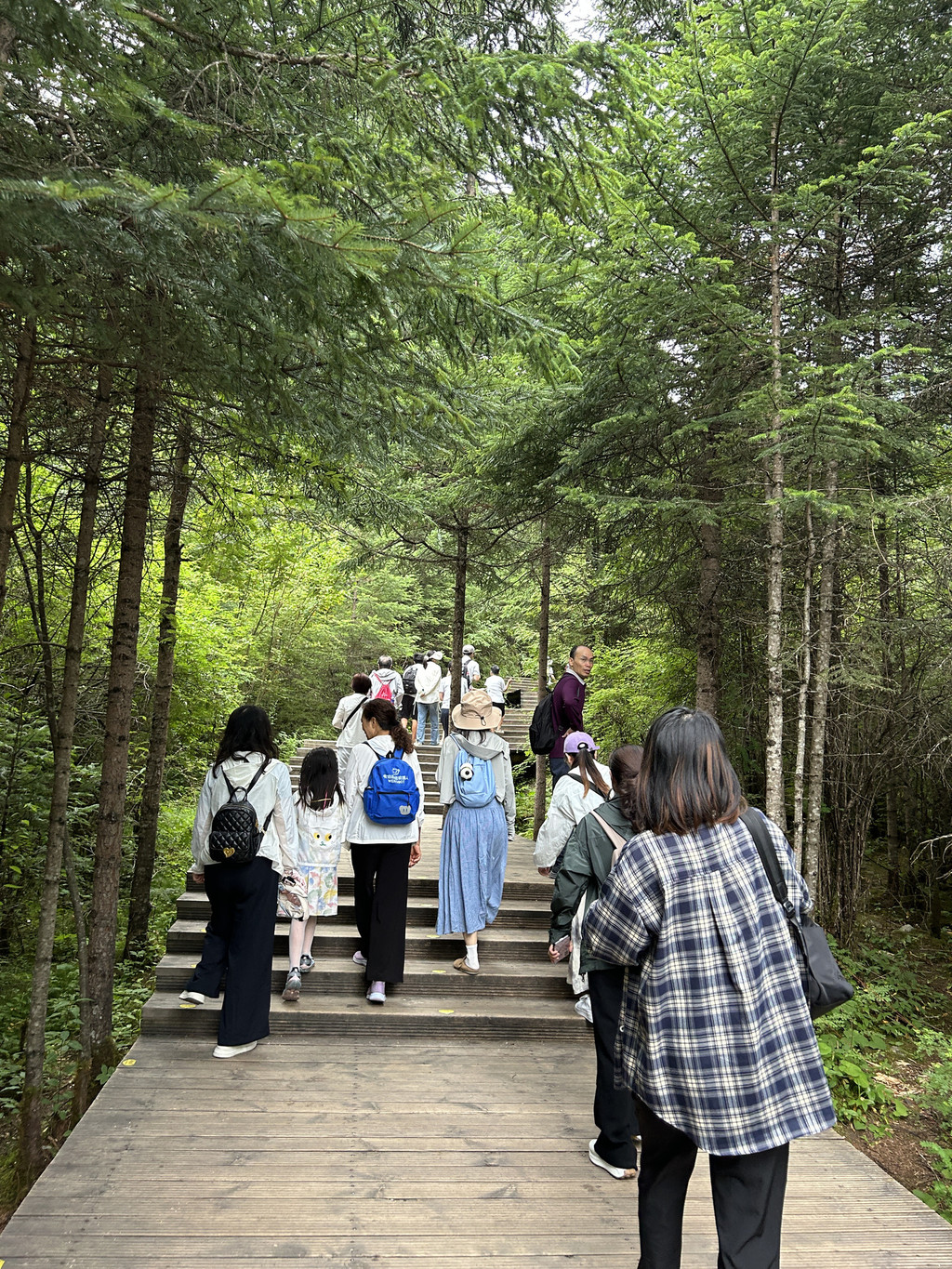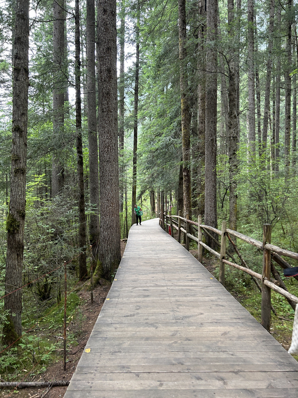 观光车第一站将我们送到原始森林。原始森林里的空气沁着松针的清香,每片苔藓都像捧着晶莹的露珠。众多参天树之间,树干上层层叠叠的鲜绿苔藓像裹着碧绿的绒毯。