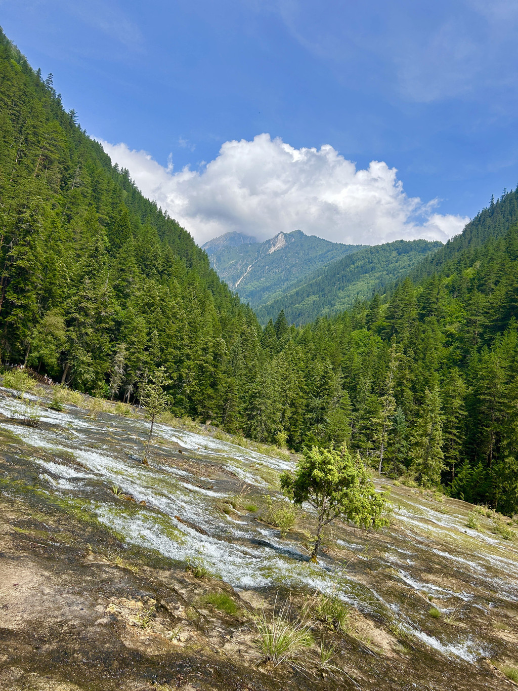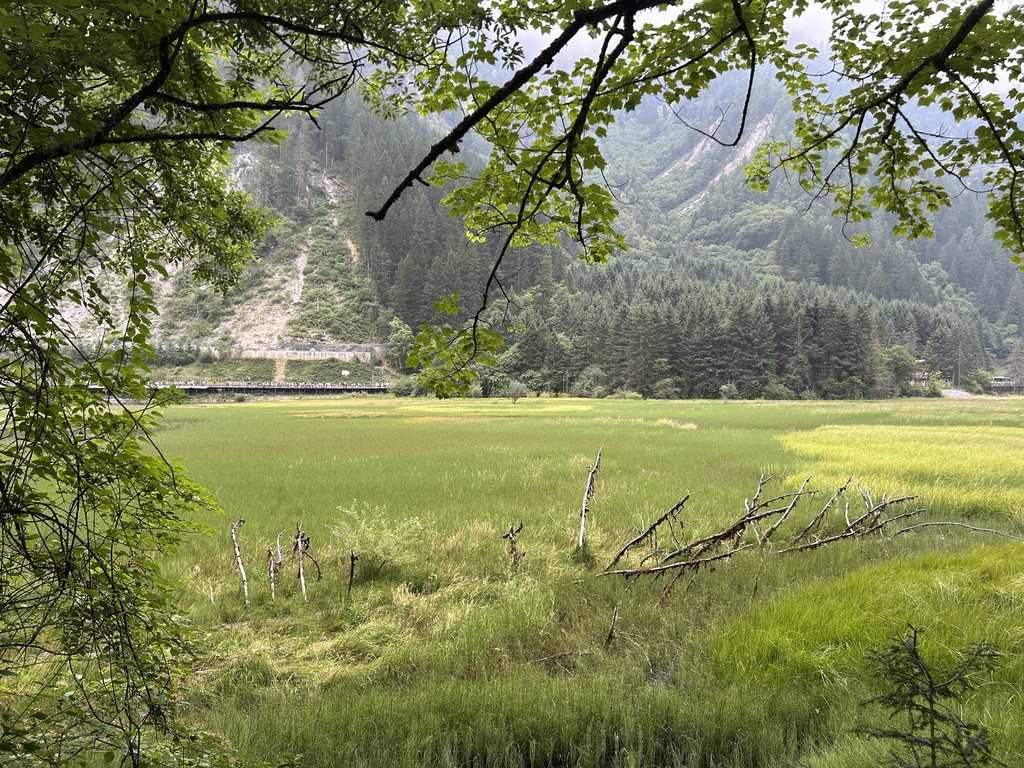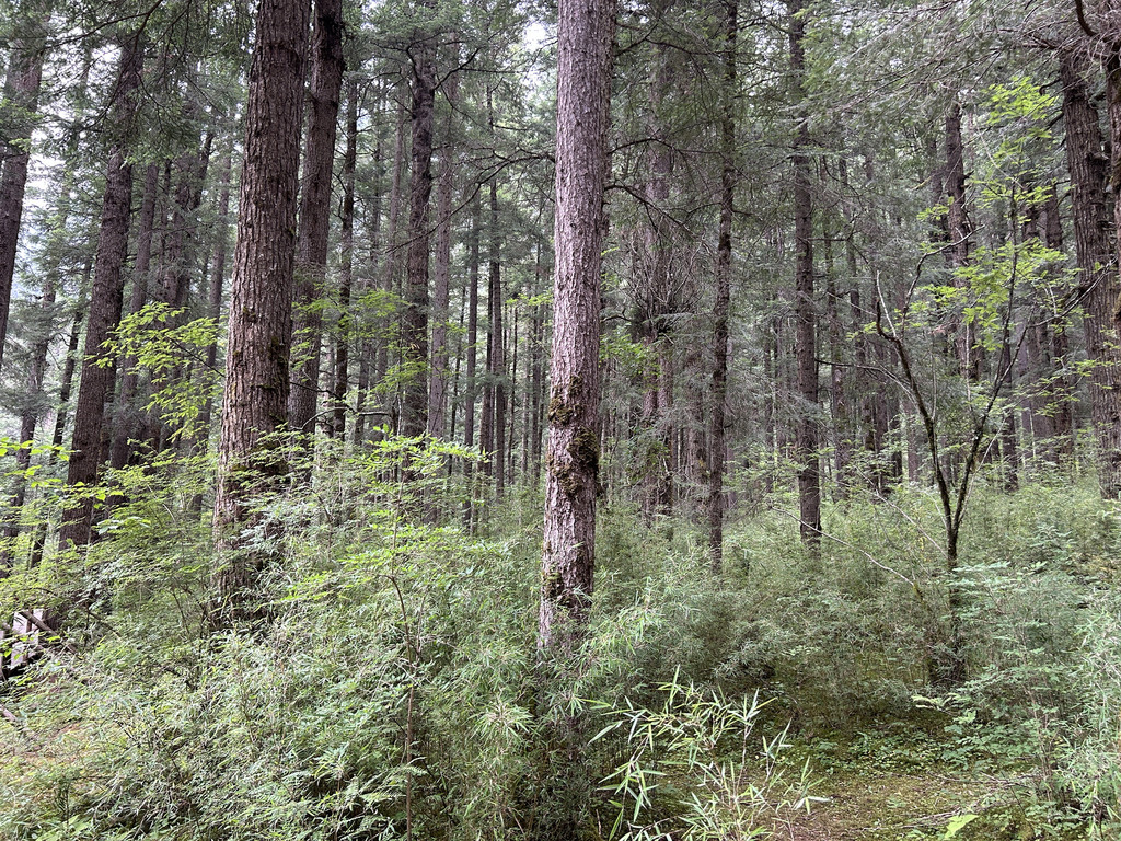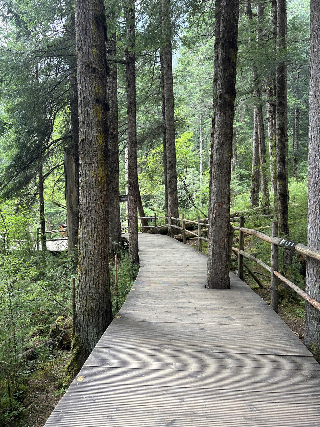 观光车第一站将我们送到原始森林。原始森林里的空气沁着松针的清香,每片苔藓都像捧着晶莹的露珠。众多参天树之间,树干上层层叠叠的鲜绿苔藓像裹着碧绿的绒毯。