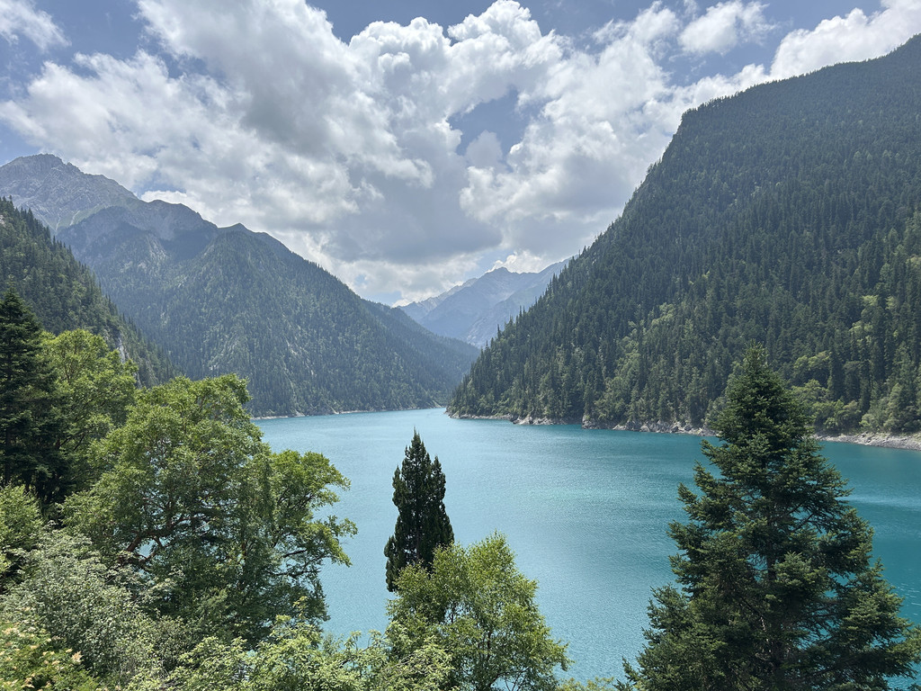 长海像深蓝色的绸缎铺展在群山之间,四围之山,层叠葱翠。右侧最高峰赭石壁立,倒映海中,如城如幕。但它还是像面清晰的大镜子,蓝天倒映在水中,显得更加纯洁,青山倒映在水中,显得更加翠绿,游人倒映在水中,显得更加楚楚动人。长海就是这样神奇,它令所有的游人都陶醉在它的深情画意之中。