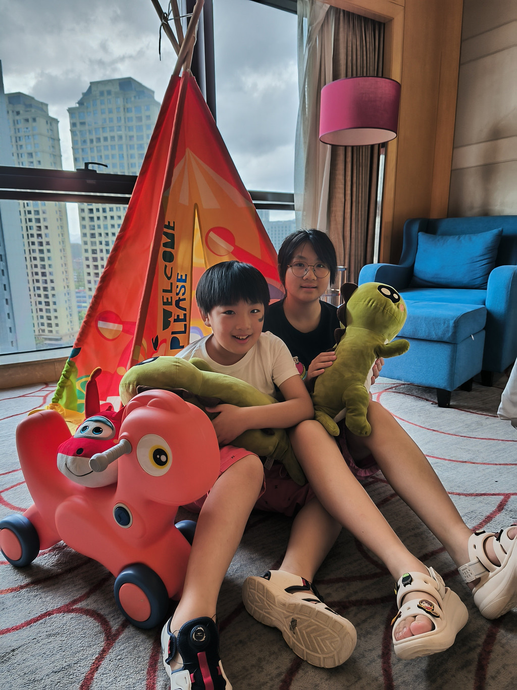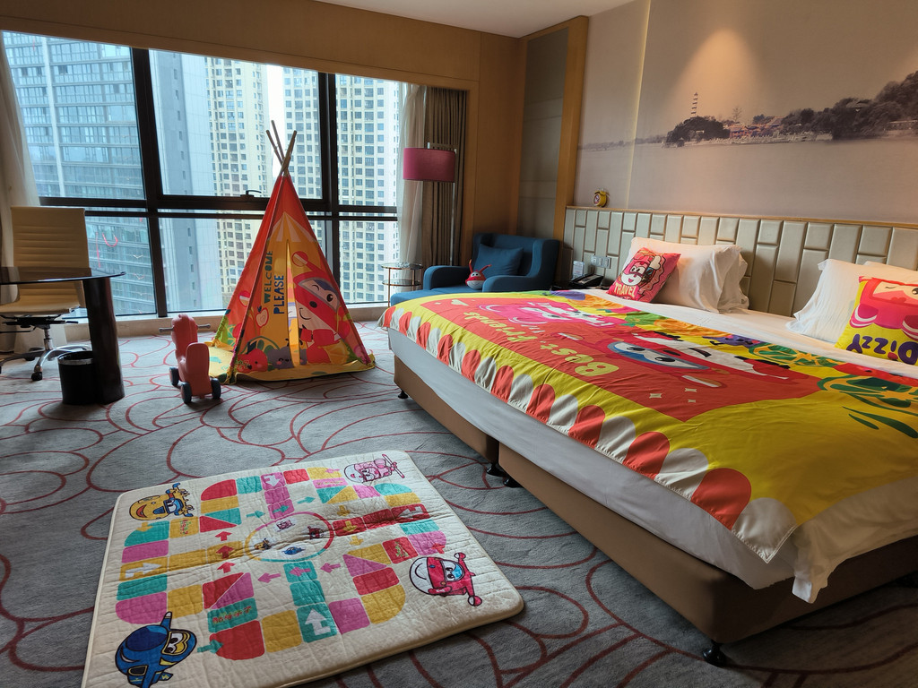 中午在“老温州”吃了中饭后入住温州铂尔曼酒店,发现两个娃对这些4A5A级景点没多大兴趣,反而对每天住的酒店特别感兴趣,跟开盲盒一样,今天铂尔曼酒店开到的是超级飞侠主题亲子房,把娃给开心坏了,激动的想把乐迪玩偶抱走,可惜酒店不让,只好网上给他买了个一样的
