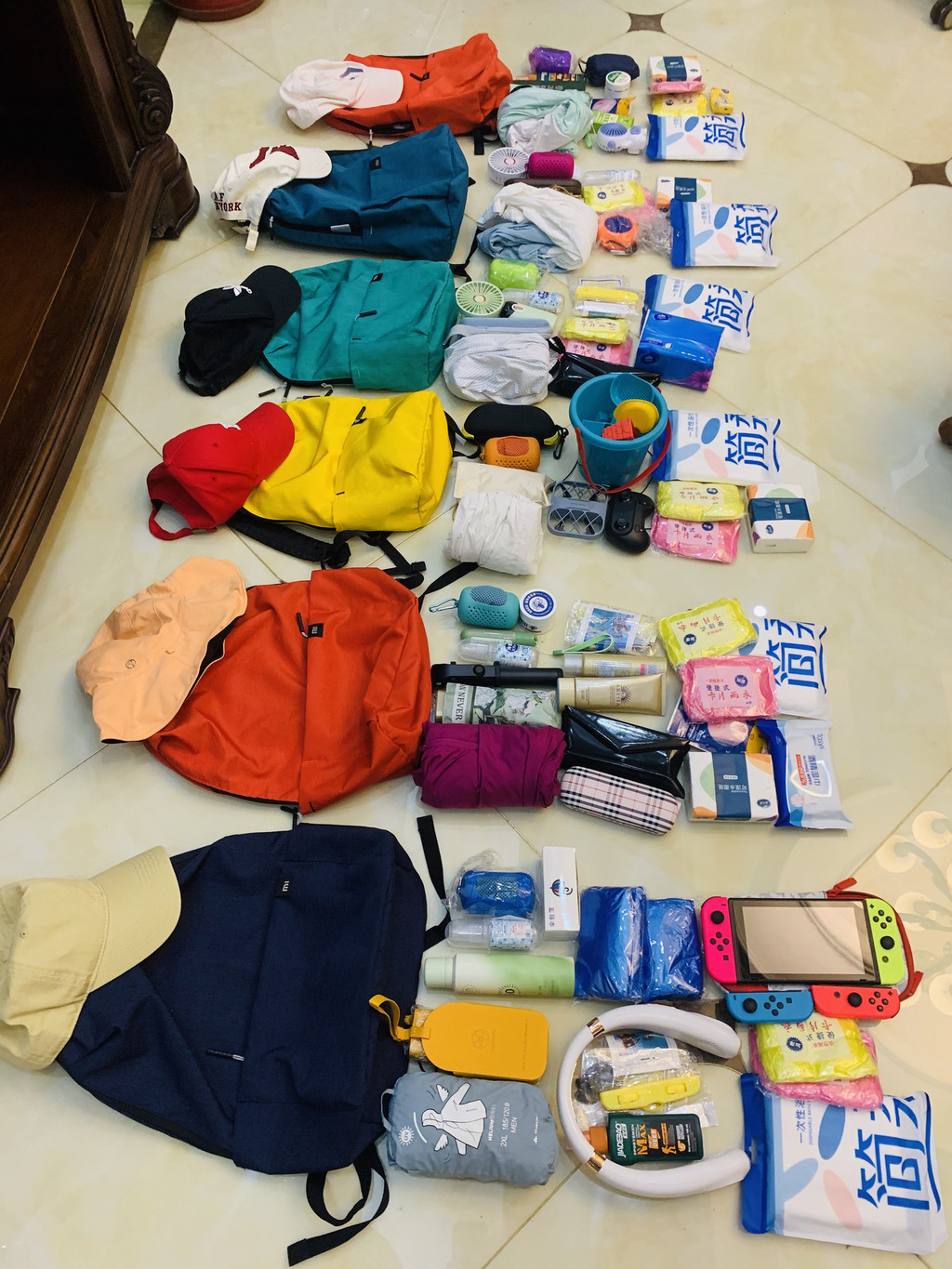 做好了各项准备工作,买了一堆的防暑、防嗮、防寒、防蚊、防雨、防困的装备和药品,并且全家六口人一人一个背包分配好,另外还有两个行李箱装衣服。