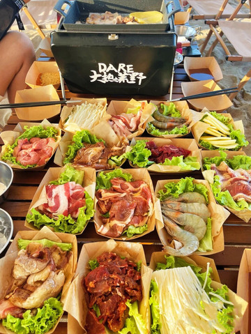 海风静静吹着、听着音乐、吃着烤肉、喝点小酒