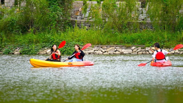 来玩皮划艇的游客还挺多。我们心里痒痒也预定了,穿好防护服,做好防护措施就坐上了皮划艇。我们坐在皮划艇上,一边欣赏风景,一边划着小船,享受着清凉的河水。这让我想起了一首诗:“小舟从此逝,江海寄余生。”看着眼前的美景,惬意极了。
