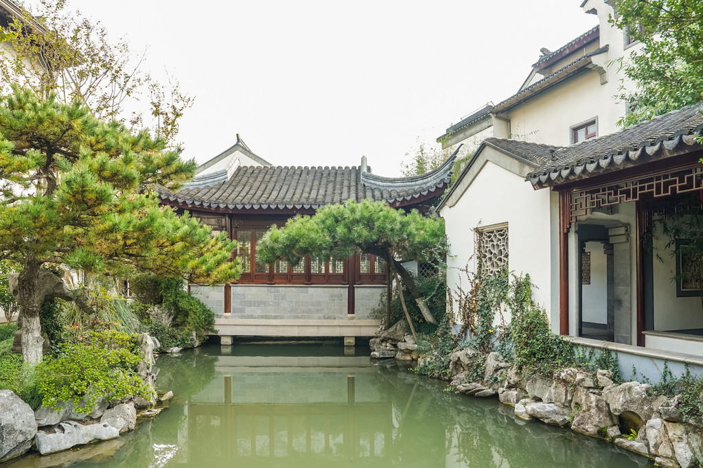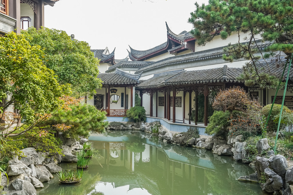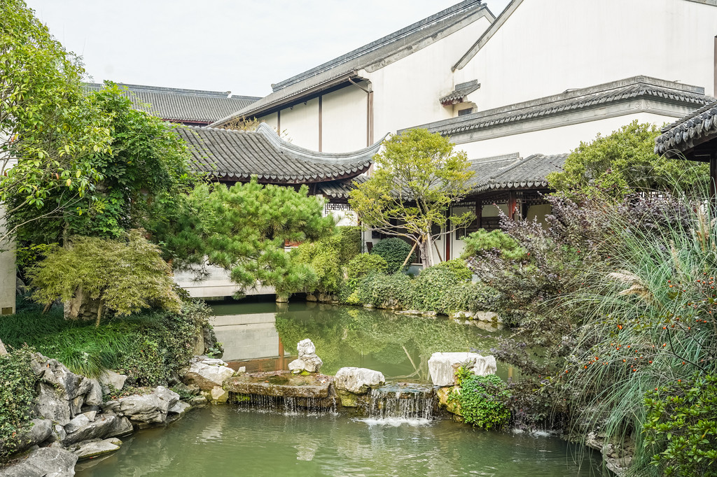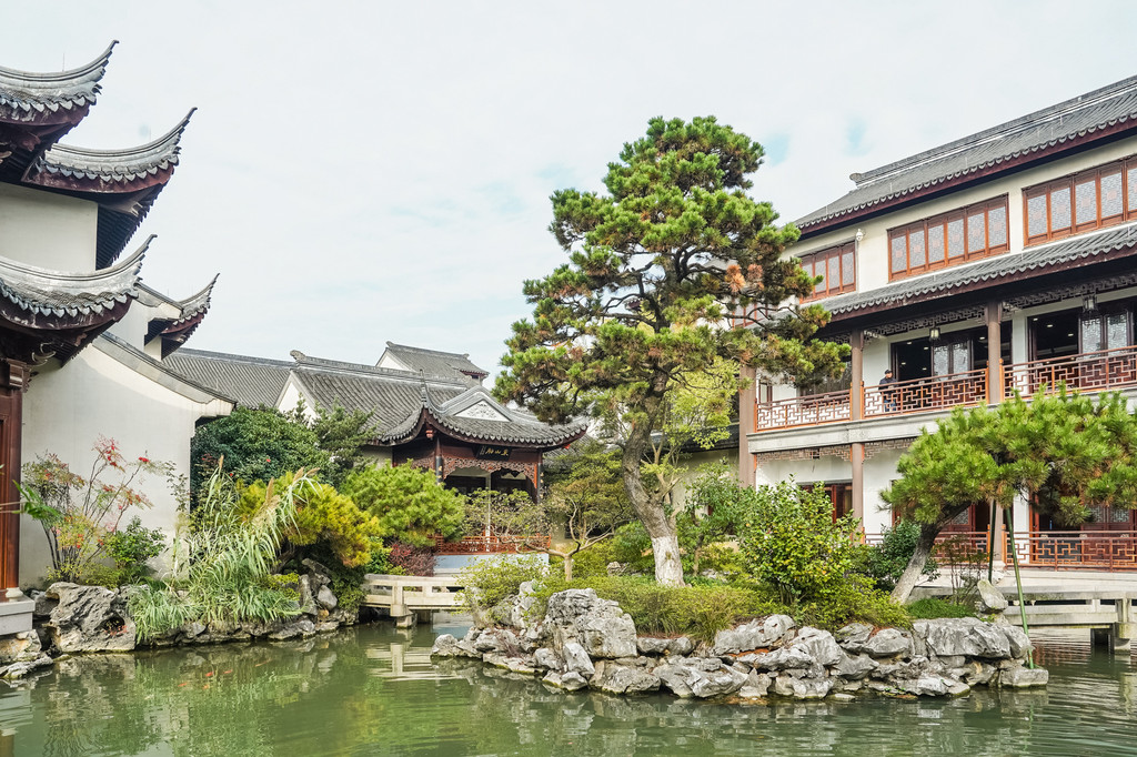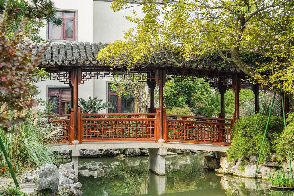 这是个中式古典园林建筑风格的博物馆,园内小桥流水、白墙黛瓦、亭台水榭,回廊飞檐、草木游鱼,给人以一步一景,清新雅致之感。