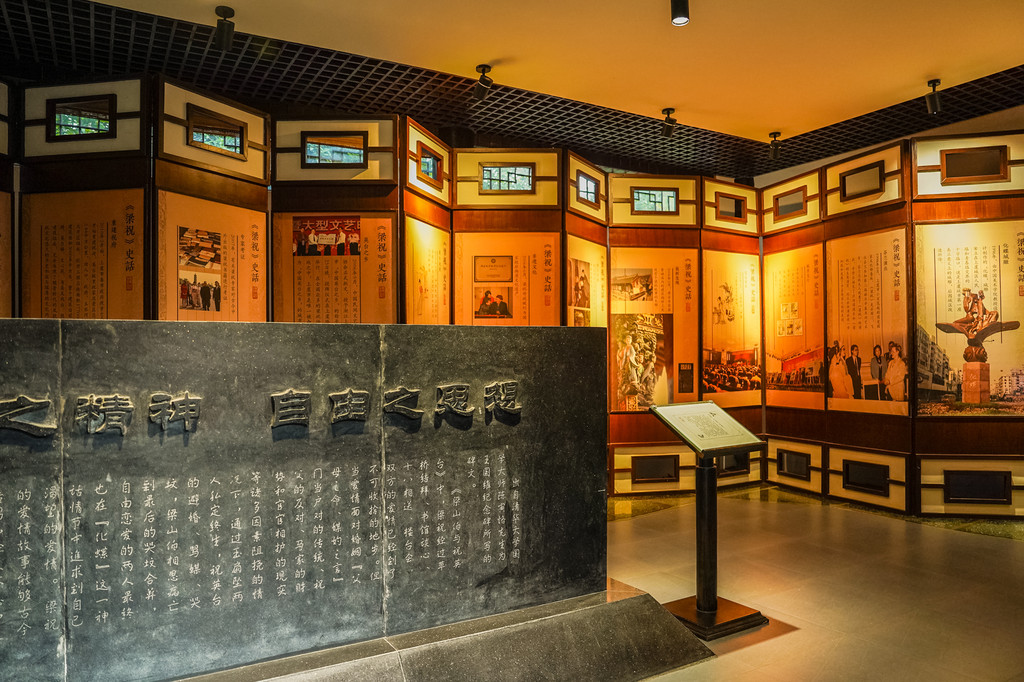 在这里,我还参观了祝英台的闺房,纱帐、纱帘、茶几香案、铜镜等精致的家具和摆件一应俱全。桌上还有文房四宝,琴案屏风,再点上檀香,配上古典音乐,氛围感拉满,真实再现了古时大户人家小姐的生活状态。