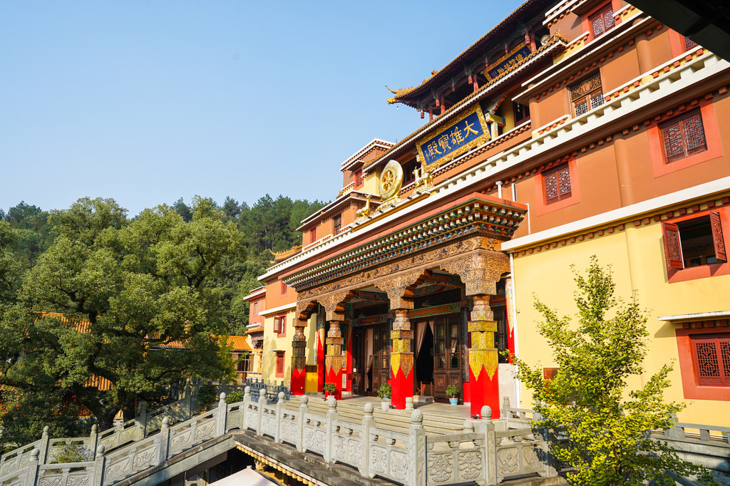 整个建筑群沐浴在阳光下,更显庄重。此时的阳光呈现出金黄色,透过窗阁洒在镀成金色的佛像上。金色加金色反射出耀眼的金光,远望去就像是整个大殿在向外发出金光,把大殿门前也染成金色。