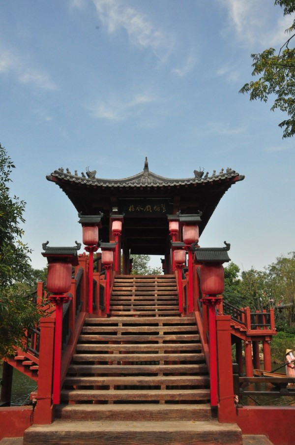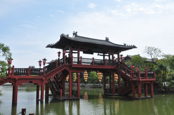 水心懈:清明上河园中的这座水心懈,四面临水,一桥相连,显得通透空灵;榭顶玲珑,清丽雅致,仿若出水芙蓉。