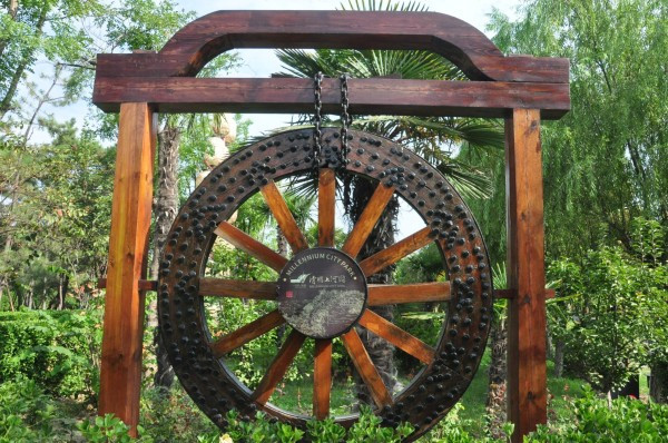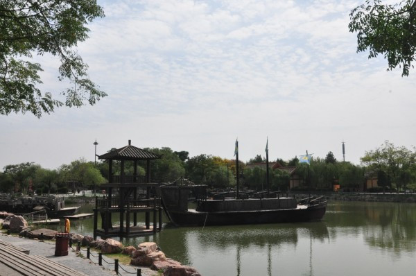主题广场:广场前有张择端站像、后有清明上河图传奇故事浮雕的影壁。广场中央的池水中浮动着一只造型古朴的宋代木船,船上桅杆高耸,云帆高挂,象征着宋代繁忙的漕运和高超的造船技术。