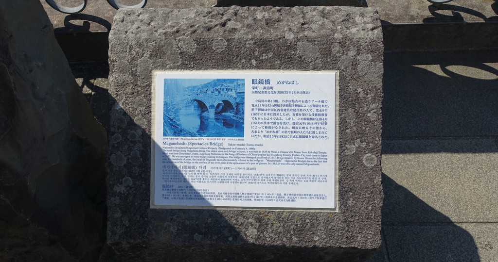 眼镜桥是一座建于 1634 年的石桥,由来自中国兴福寺的僧人默子如定建造。据传是日本现存最古老的石桥。