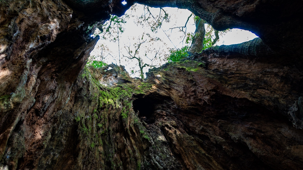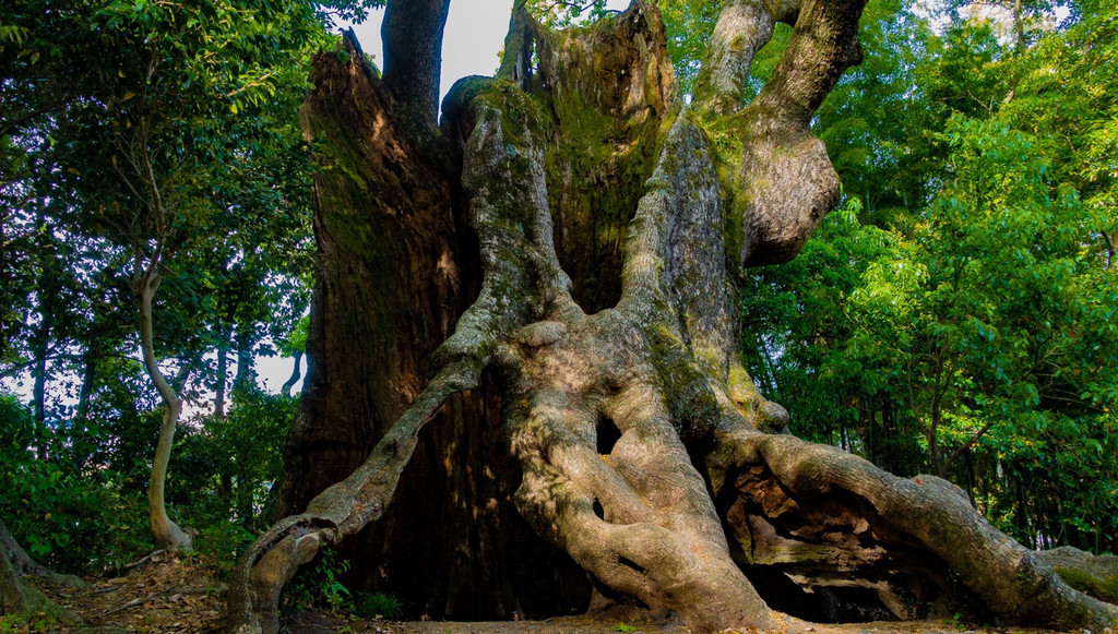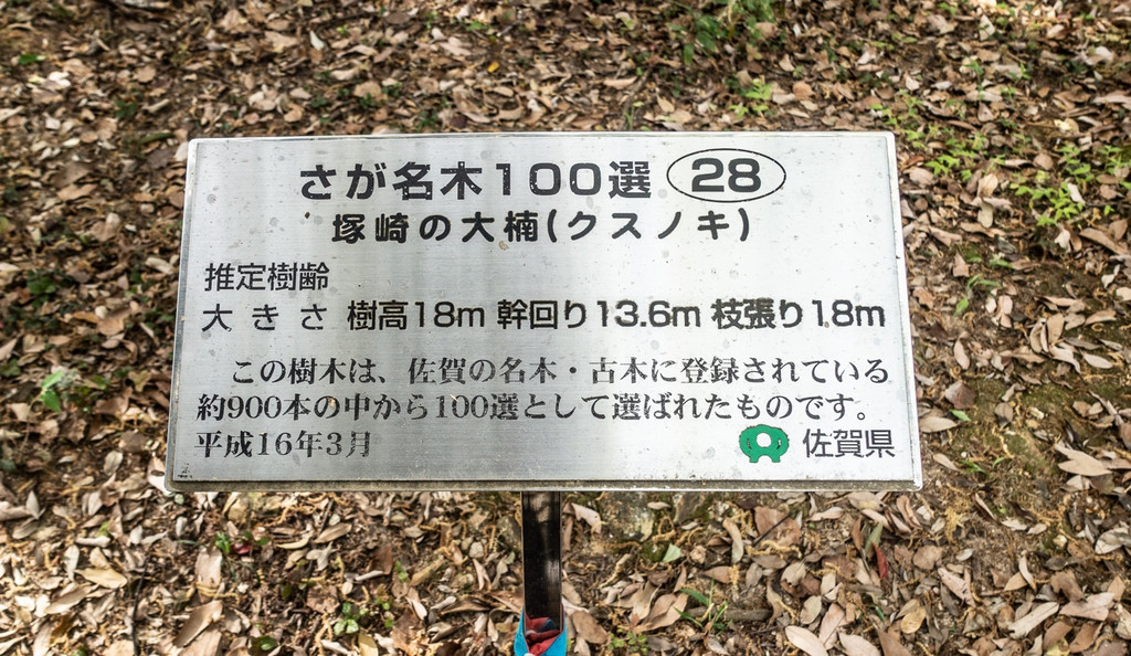 塚崎大楠是佐贺县内排名第三的巨树,树龄有2000 年之久,也有 3000 年之说,被认定为武雄市的天然纪念物。树高 18m(南侧的史枝),树干周长 13.6 米,树冠向四面延伸,东西18 米,南北 15 米。1963年该树曾被雷击中,主干部分9 米多被毁,令人惋惜。巨树根系错节,深达 38 米,由此也不难想象曾经的巍然之姿。