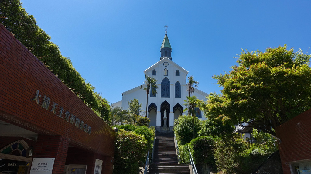 被日本认定为国宝的大浦天主堂是一座天主教堂,建于 1865 年。教堂外部呈白色,与蓝天交相辉映;内部是绚丽夺目的彩色玻璃。据悉部分彩色玻璃由法国制造,有150 年以上的历史,是日本最古老的玻璃。要留意教堂内部严禁拍照、摄影。