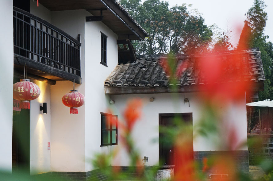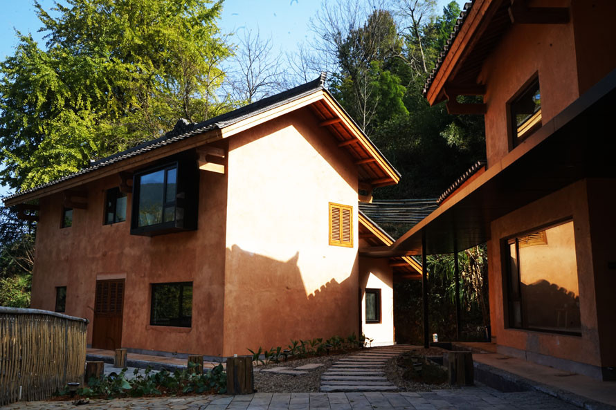 旁边的黛瓦民居升起炊烟,有鸡鸣声和孩童的嬉闹声传来,点缀了一方静寂时光,这样的际遇让内心顿觉踏实安详。站在宽大的落地玻璃窗前远望,对面山坡散落着几排白墙房屋,房屋前是一片次第向下的梯田和下山的公路,当这些场景铺陈于视线的时候,任谁都忍不住要成为这画中人了。