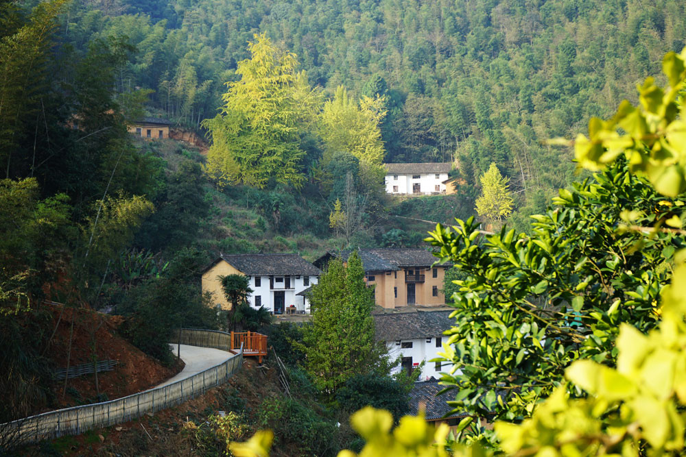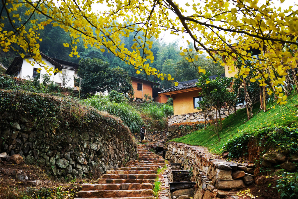 这片“豪宅”有一个名字叫“高岭宿集”,是中国扶贫基金会联手中国三峡集团援建的旅游扶贫设施,也是江西省第一个高端民宿,青石板小径在银杏树下延伸,阳光投射过来,颇有行走于世外的质感,层层山川与错落的民居以及银杏、竹林在谷底构成一幅绝美图画。