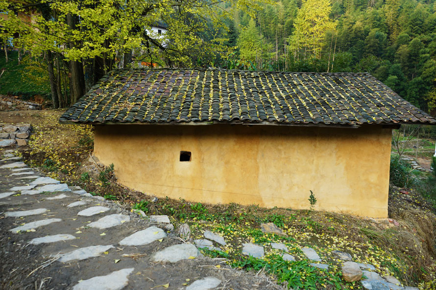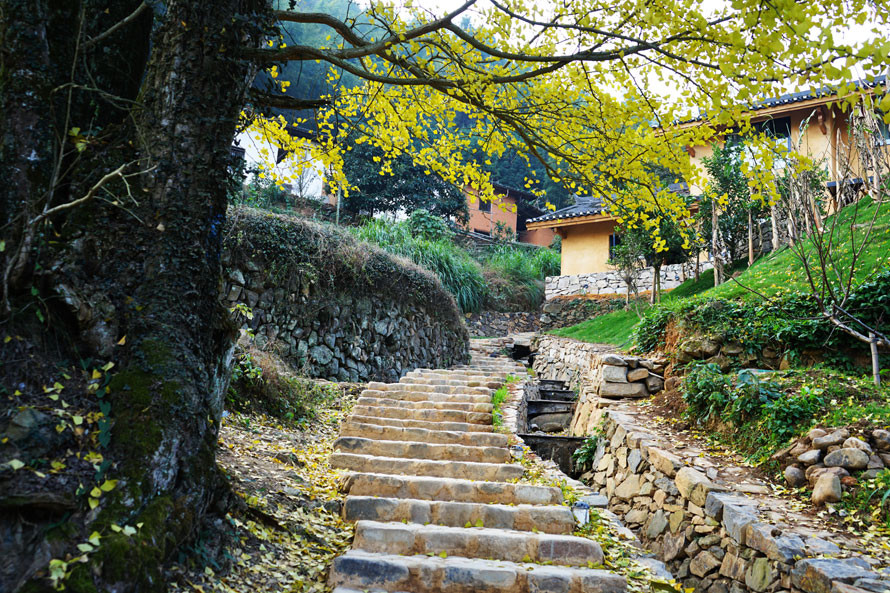 游走在这方峡谷,不时地能看到几颗高大的银杏树在房前屋后散发着耀眼的金黄,一条石板小径蜿蜒而上,路边一颗虬髯的银杏树目测有上千年了吧,底部粗糙的树干上衍生出数棵枝干蓬勃于岁月,与母体相依相伴,树下有一间无人居住的老屋,用相机取了一下景,立马被这画面所陶醉。