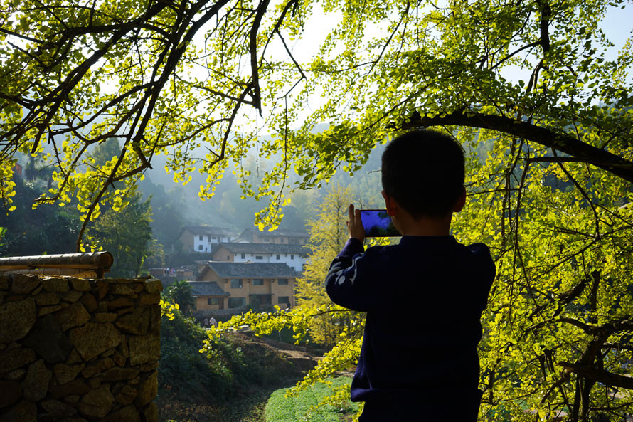 半山腰的高岭宿集一处村宿旁,一个孩童在用手机拍照,他小小的身影在古银杏树下与阳光、青草和远处的建筑一起成为图景,不断有人以村宿为背景,或者取景于银杏树,摆出各种姿势拍拍拍,然后感叹:太美了。