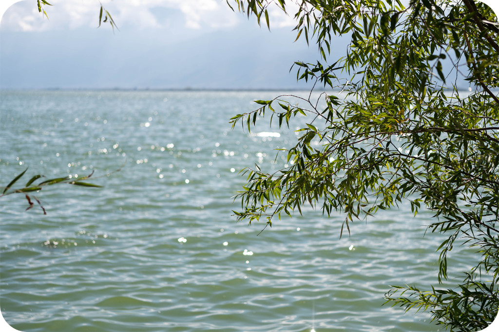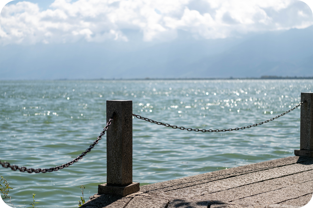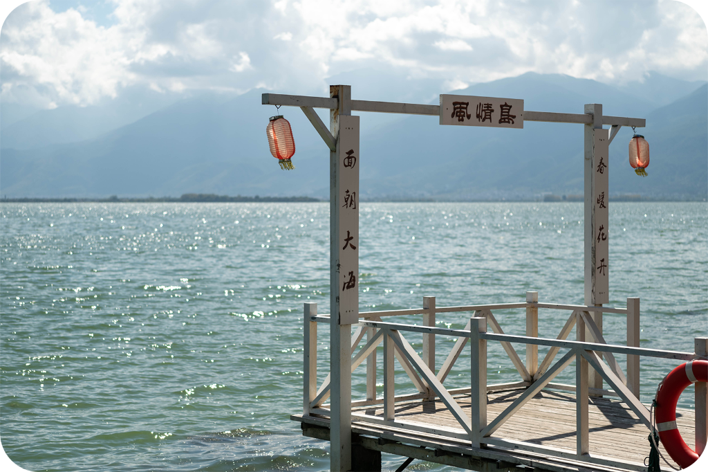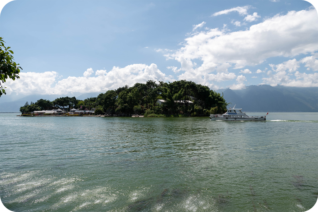 走上小岛的海滨栈道,远方便是湛蓝色的洱海,浪花在阳光的照射下形成了一个个美丽的光斑。