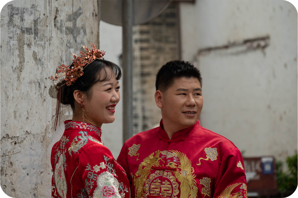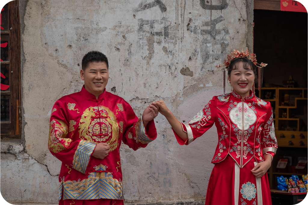 继续漫步在古镇内,偶遇一对身穿传统服饰的新人正在拍摄结婚照,幸福的笑容溢于言表。