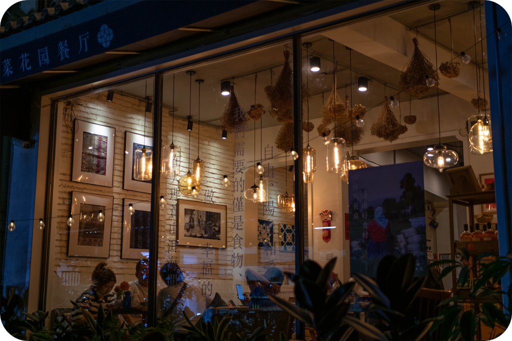 晚上再次经过这里的时候,当灯光亮起,用餐的氛围感也更浓了。