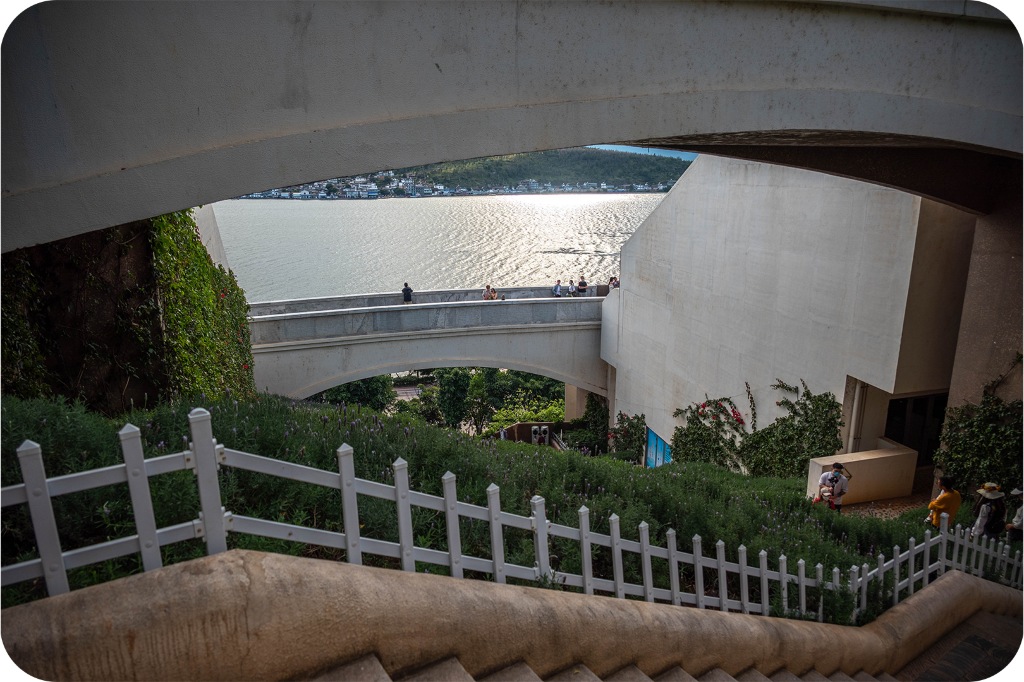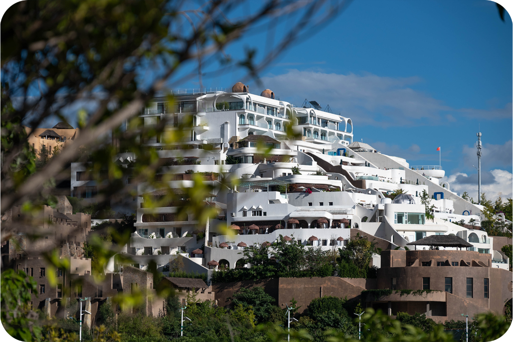 去年从大理古城出发,经大理市区换乘另一辆公交车后便直接到达了理想邦的入口,途中并没有见到过理想邦的全貌;而如今从北侧的双廊出发往南走,当快到达理想邦的时候,眼前这座未来之城的全景着实惊艳了我!