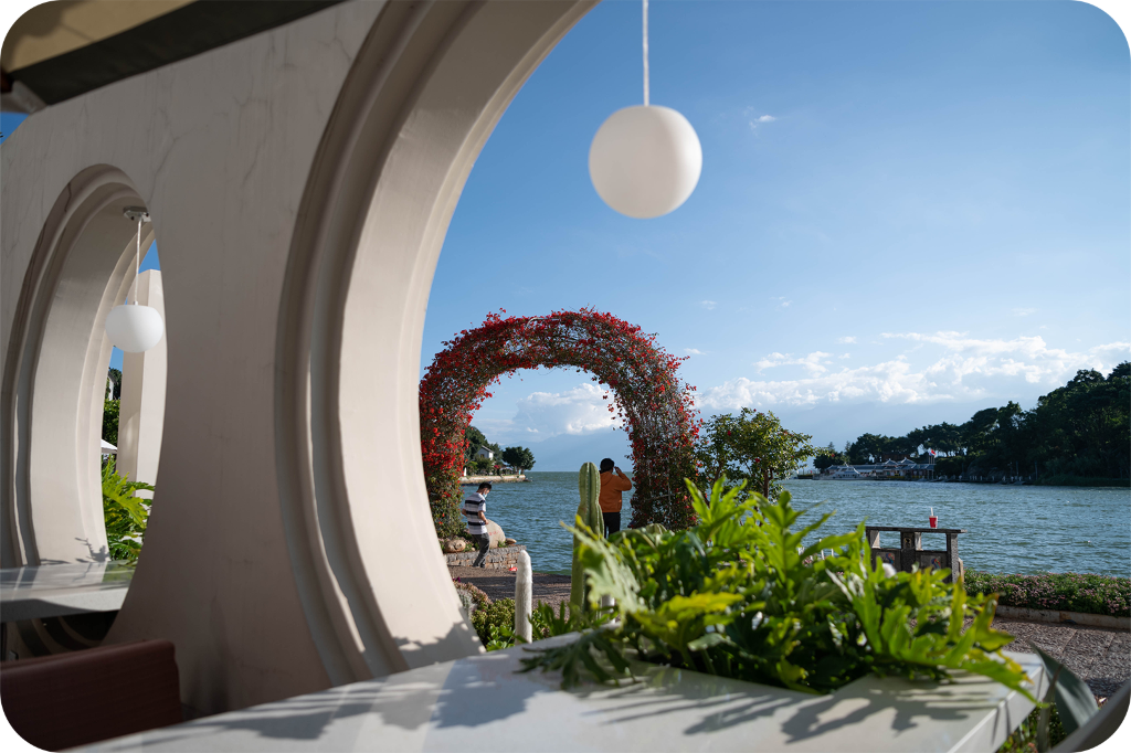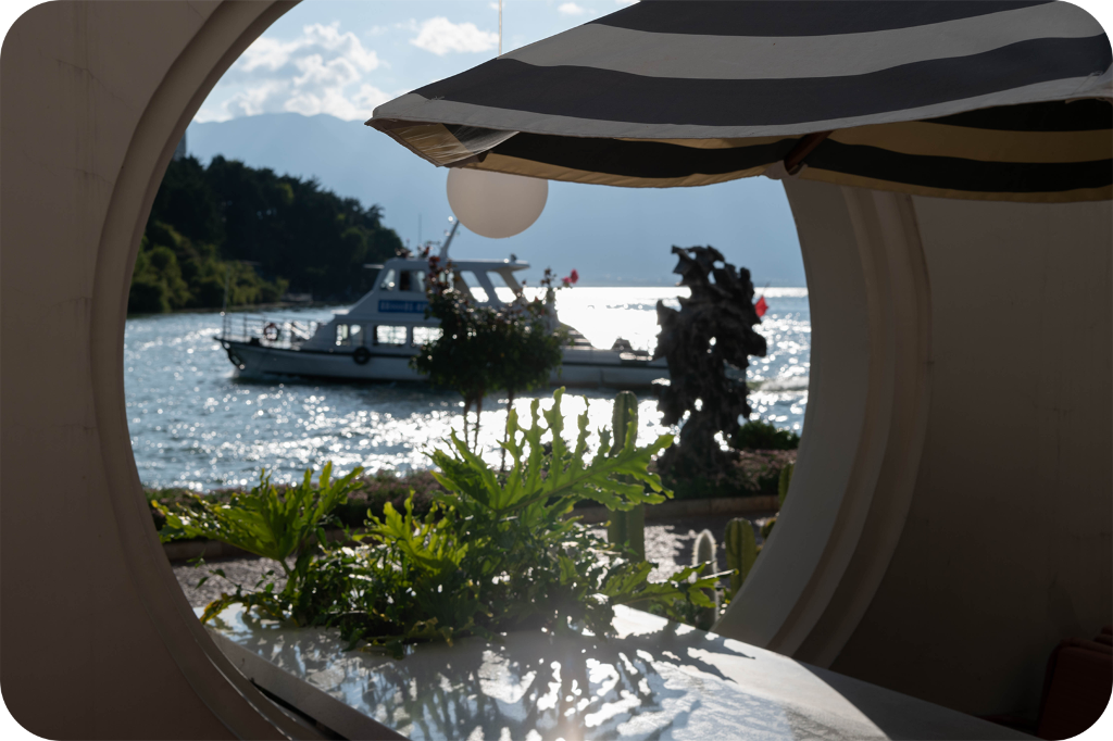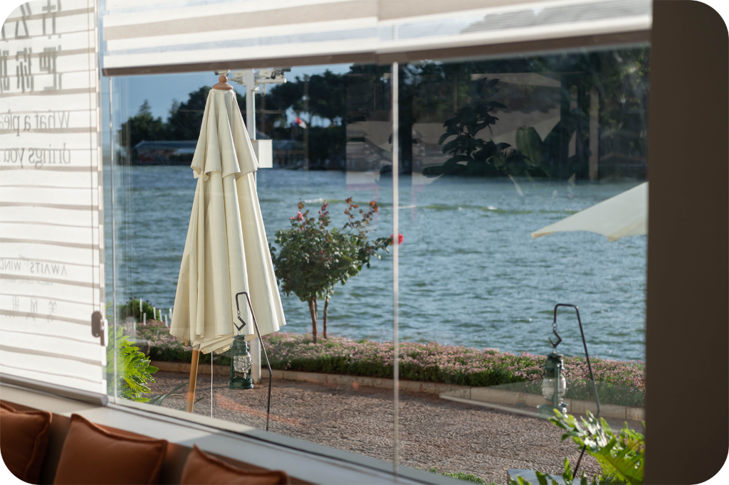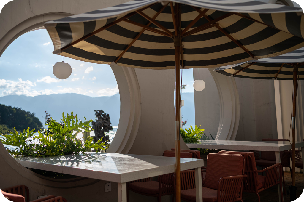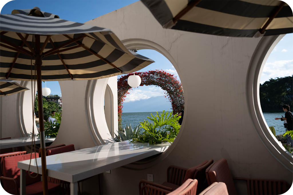 一楼咖啡厅的外面,有一把大大的遮阳伞,和旁边的蓝天白云洱海简直就是绝配。