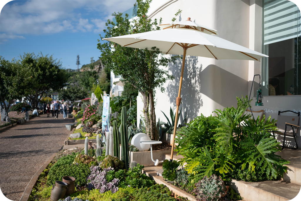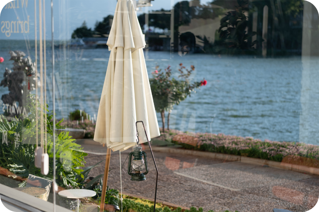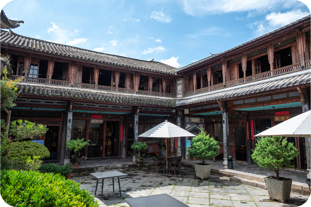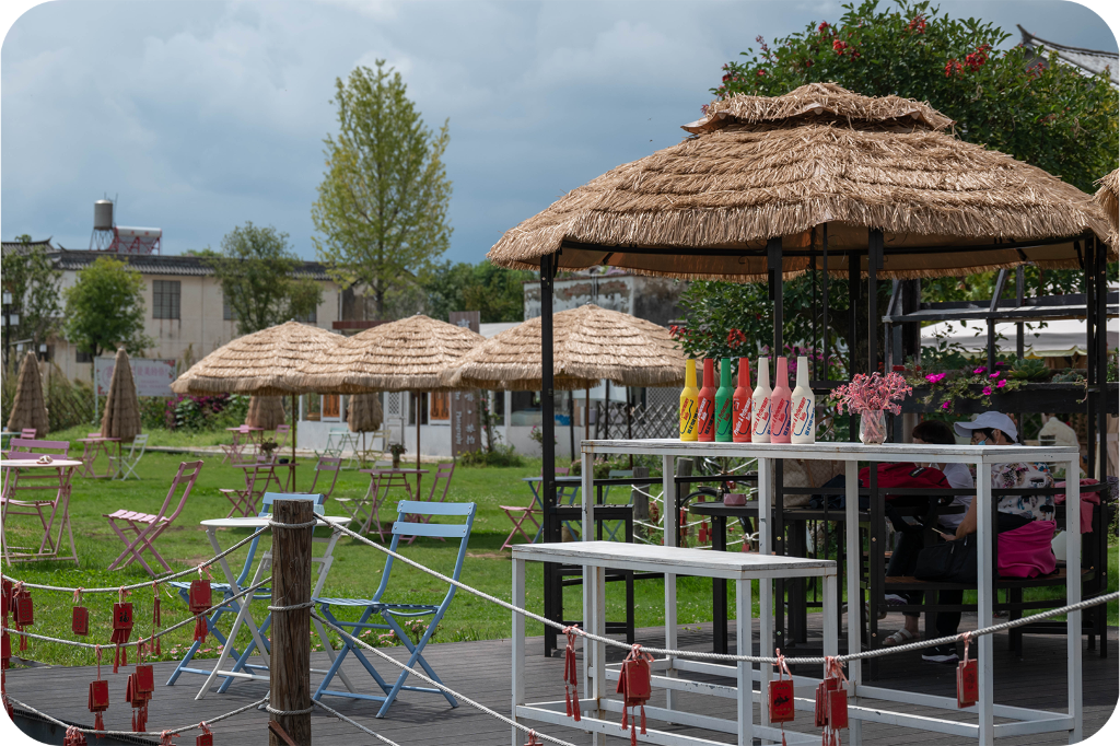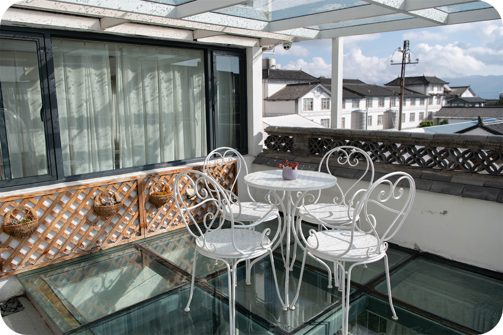 一楼咖啡厅的外面,有一把大大的遮阳伞,和旁边的蓝天白云洱海简直就是绝配。