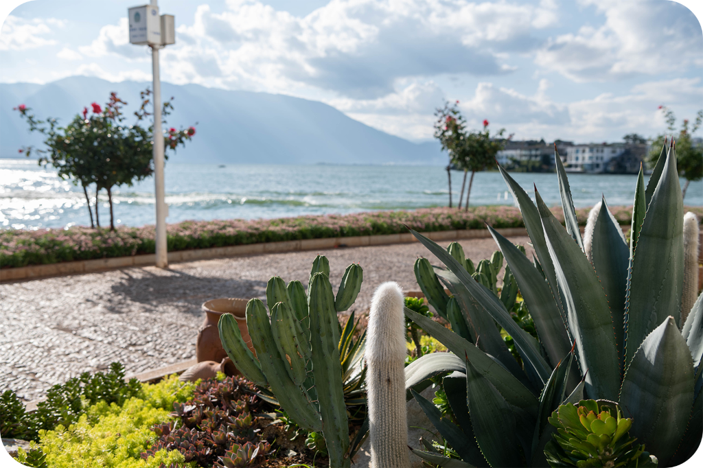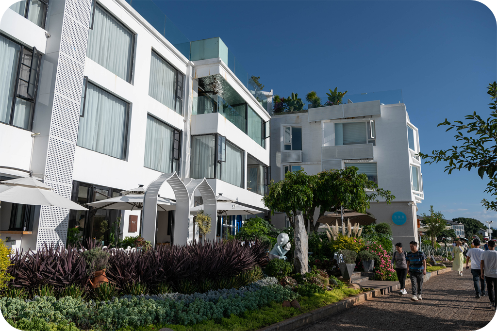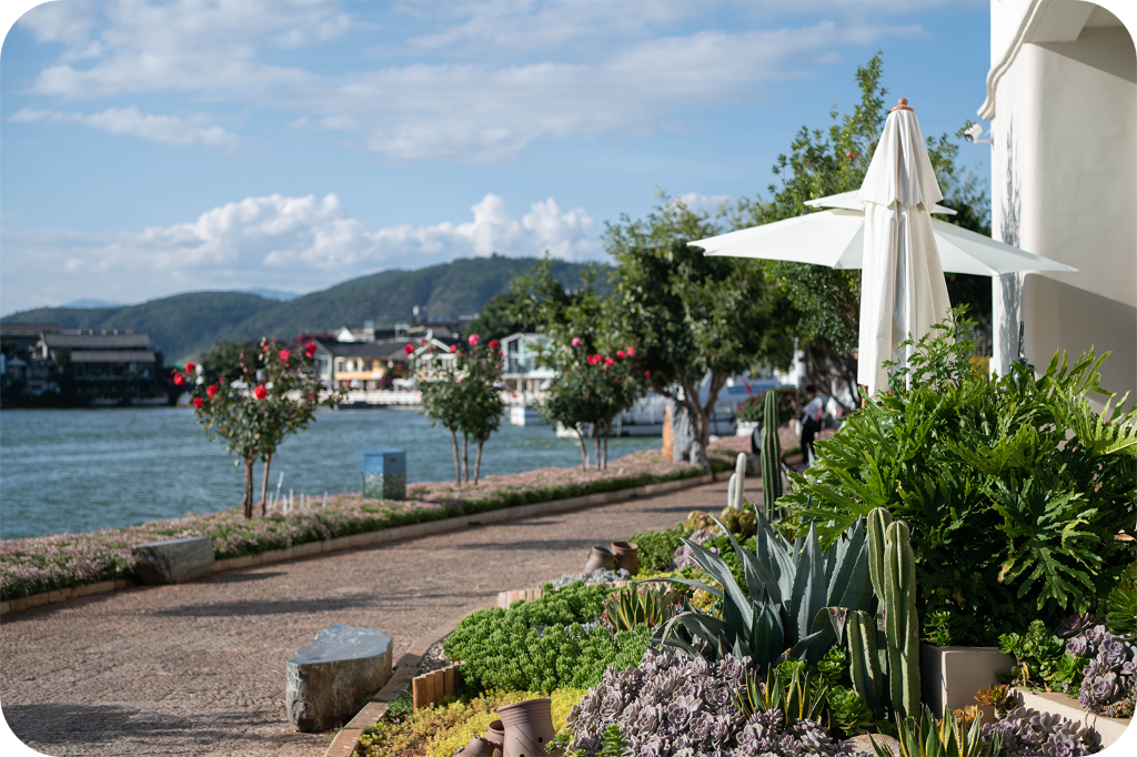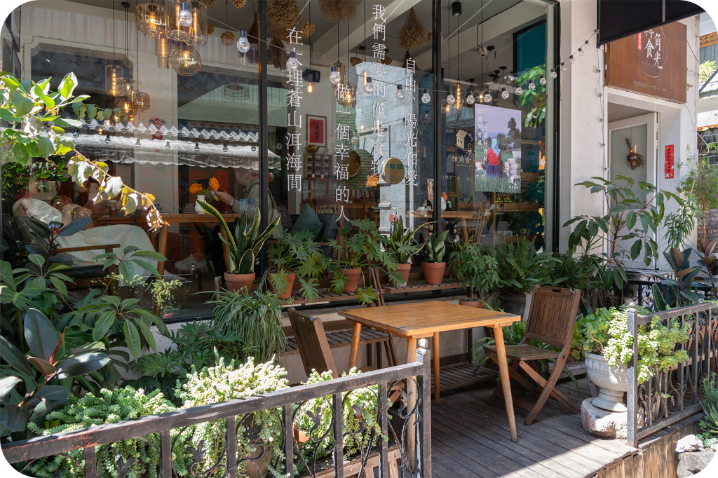 靠近洱海的这一条景观道路已经在去年翻新过了一次,沿街全都种上了满满的多肉,其中环境最美的区域,自然就是这家大理等风来无疑啦~