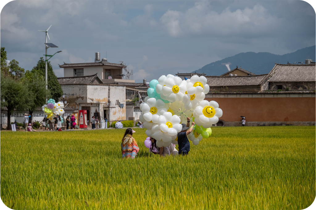 稻田里还有不少小贩正在售卖这个花朵造形的气球,很可爱。