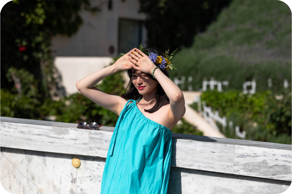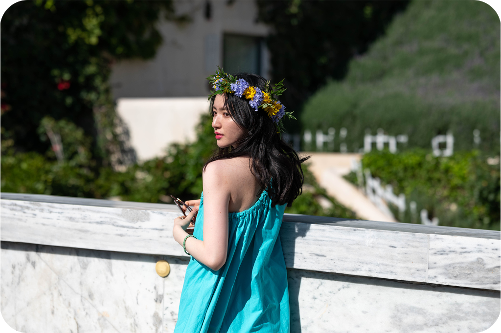 走在理想邦的街道上,路边这位小姐姐的蓝色连衣裙和小镇内的白色建筑相当益彰。