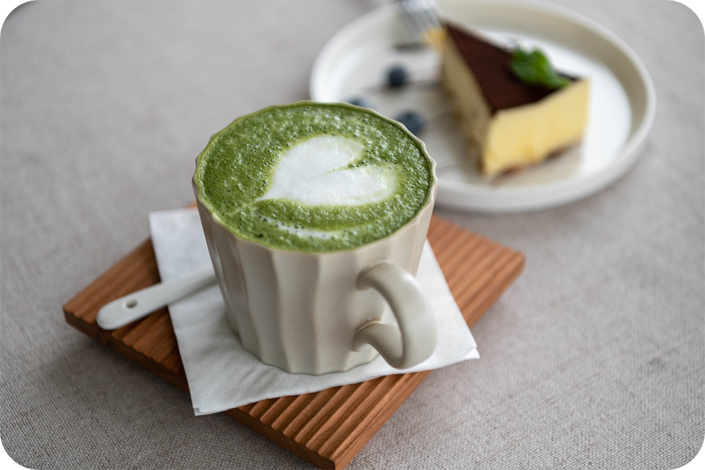 抹茶拿铁配上乳酪蛋糕,上午茶的时光也很美好。