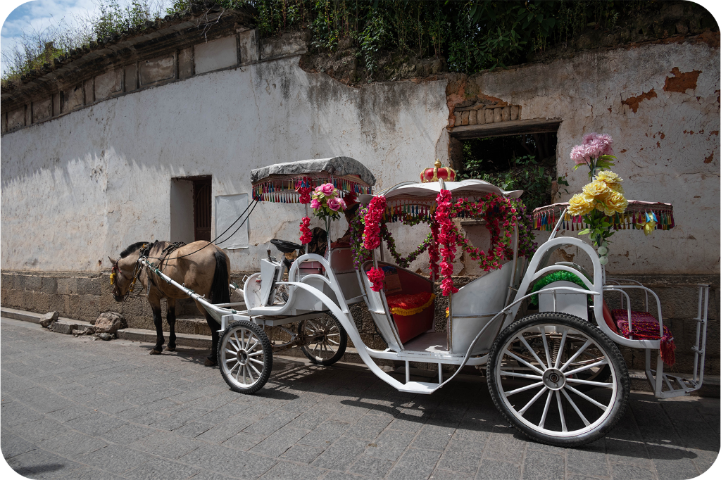 路边,还停靠着游览古镇的马车,看着马儿低下了头,它一定很累了吧。