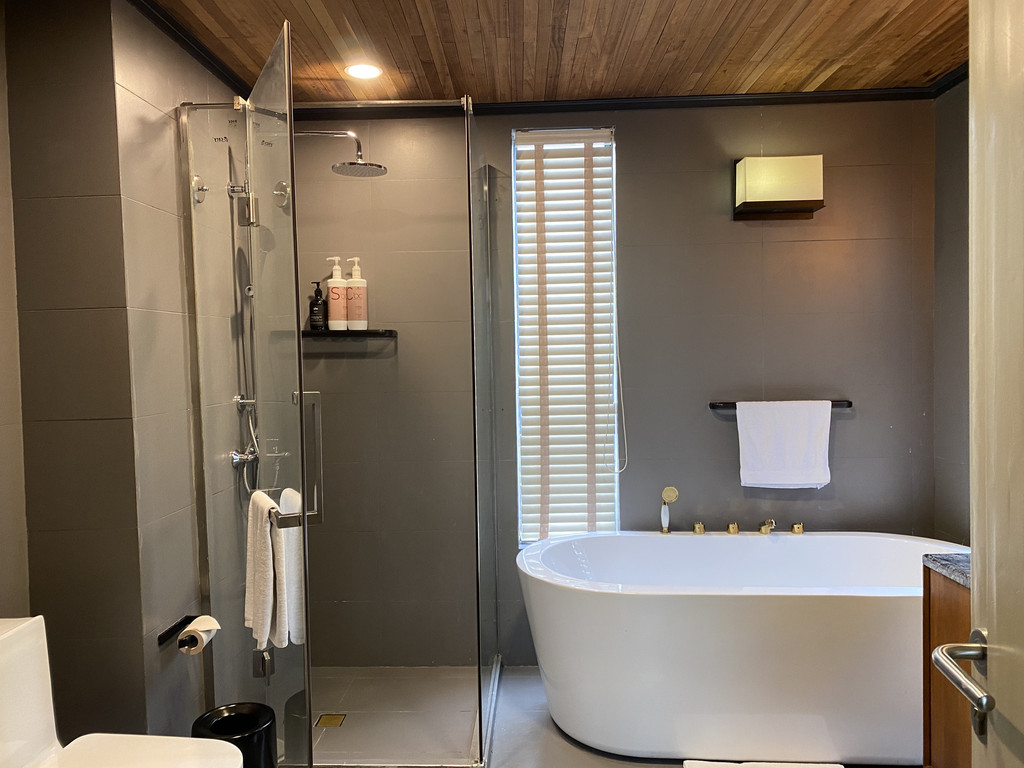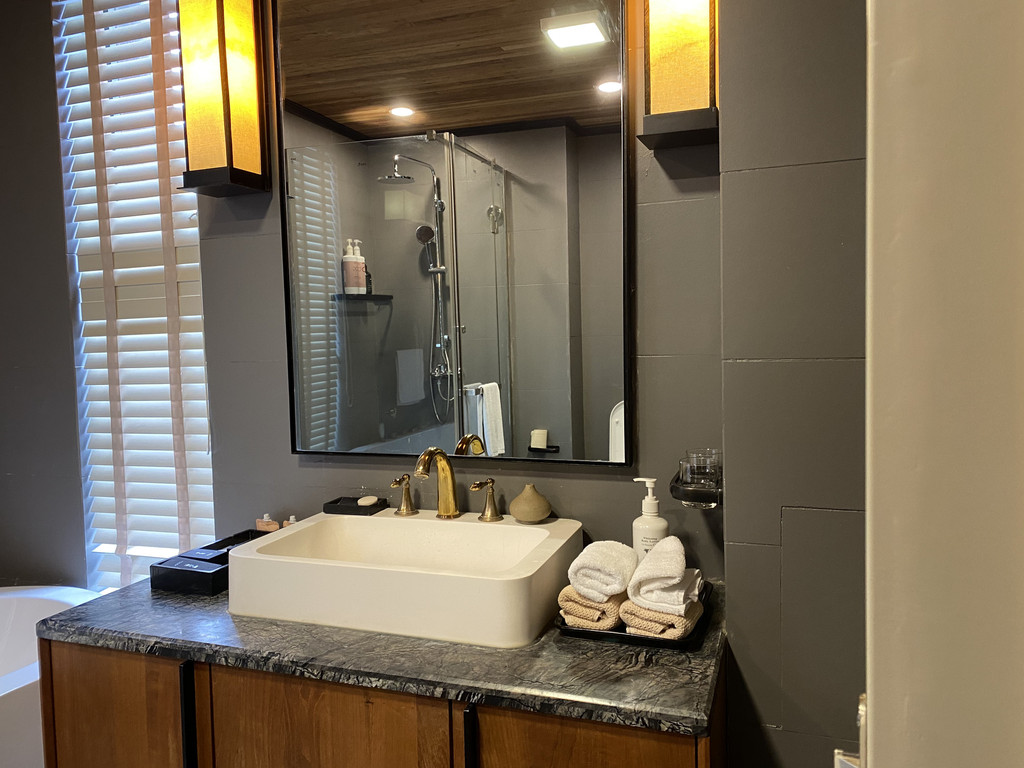 独立阳台、深褐色的原木家具、美式风的洗手间