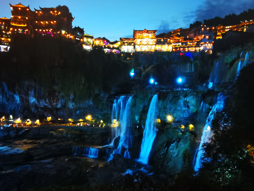 芙蓉镇最出名的就是村里的瀑布,被称为挂在瀑布上的千年古镇。在灯光的映衬下,夜景很美很动人。芙蓉镇景区内的住宿不在瀑布边上的价格还算可以,能看瀑布夜景的都比较贵,不是旺季还七八百一宿呢,河景的价格仅次于瀑布。我们是住在景区外的门口处的一家庭院客栈,傍晚的时候开始在芙蓉镇里走了一圈,看了看夜景,拍了拍照。这样浪漫的夜景,其实只有女人喜欢,男人、孩子、父母都不是很解风情。所以我也就没花大价钱去订“贵景房”。