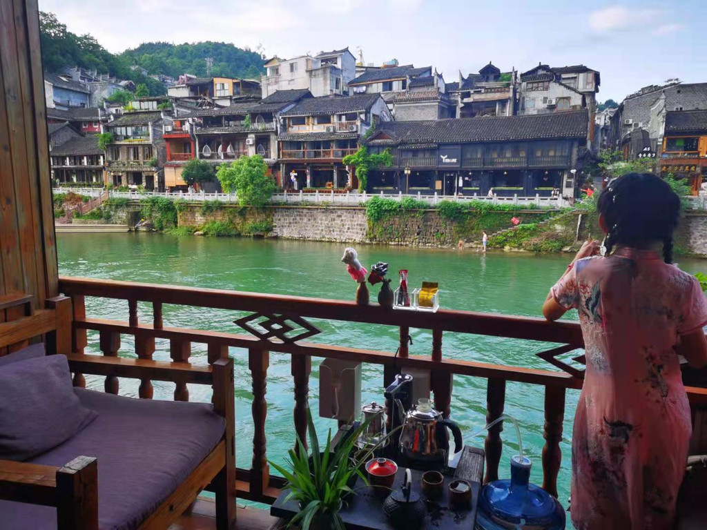 我把之前省下来的“贵景房”的钱花在了凤凰的住宿上,订了江景最好地段的客栈的江景房,且是垂直于江上的吊脚楼房间,房间的阳台直接上悬空于沱江之上的。简直就是推门推窗见江景,坐在江上赏鱼灯啊。我们5 口人定了两间房,正好是包了客栈的一层楼(每层就两间房,一共3层),几乎是独享客栈的超大超舒适的客厅,简直不要太美啊!且客栈设施齐全,用品都是高品质的,端午节后的价格在440多一晚,可以接受且觉得值了!