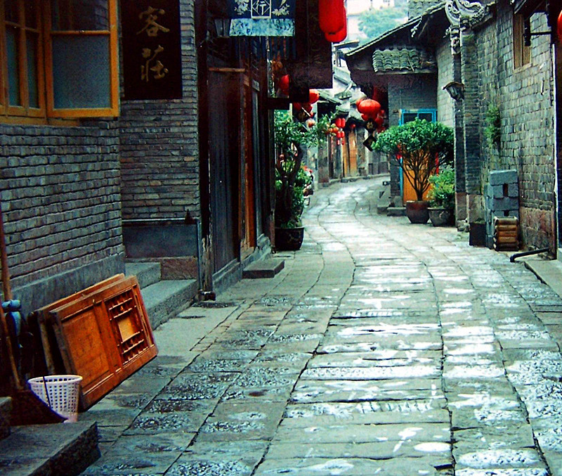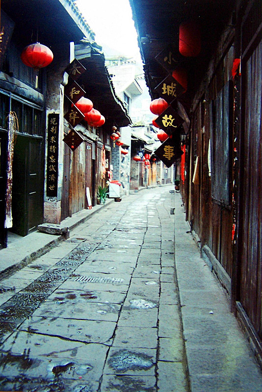 到凤凰的第一天早晨,我和朋友早起去逛老街。清晨的古城街道无人,久经磨砺的石板清幽,静静的,空空的,空气中弥漫着两旁老房子木头的有点混浊的味道,而老街也愈显其古老,苍桑,深远。那两侧被烟熏黑的油漆木门,那斑驳的墙面,似乎在向人们讲叙着凤凰过往的时光和它所经历的沧桑。我喜欢这种古老气息,我感到它是那样的熟悉,那样的亲切。不由得想起沈老的一句话:“一座亘古的城廓,装不下流逝的沧桑岁月;一条幽深的石板巷,挽不住古往今来行旅勿勿的脚步……。”