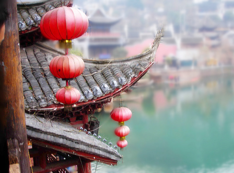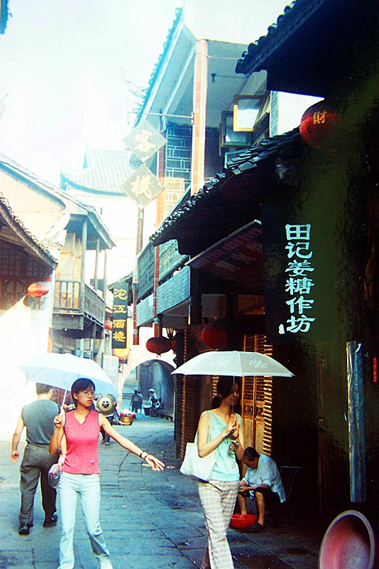 上午十点的古城已没有了清晨的安静,街上人流如鲫,甚是繁闹。临街房屋,飞檐走榭,古色古香,银饰、蜡染、姜糖,随街可见。街上虽然人来人往,两旁店铺的生意红火,但这里并没有一般小镇的听着让人气闷的喧哗、嘈杂声,一切都显得那么有条不紊,每一个店铺的老板也是不急不躁的,象街后面的沱江水,清清的、缓缓的。真是一方水土养一方人。
