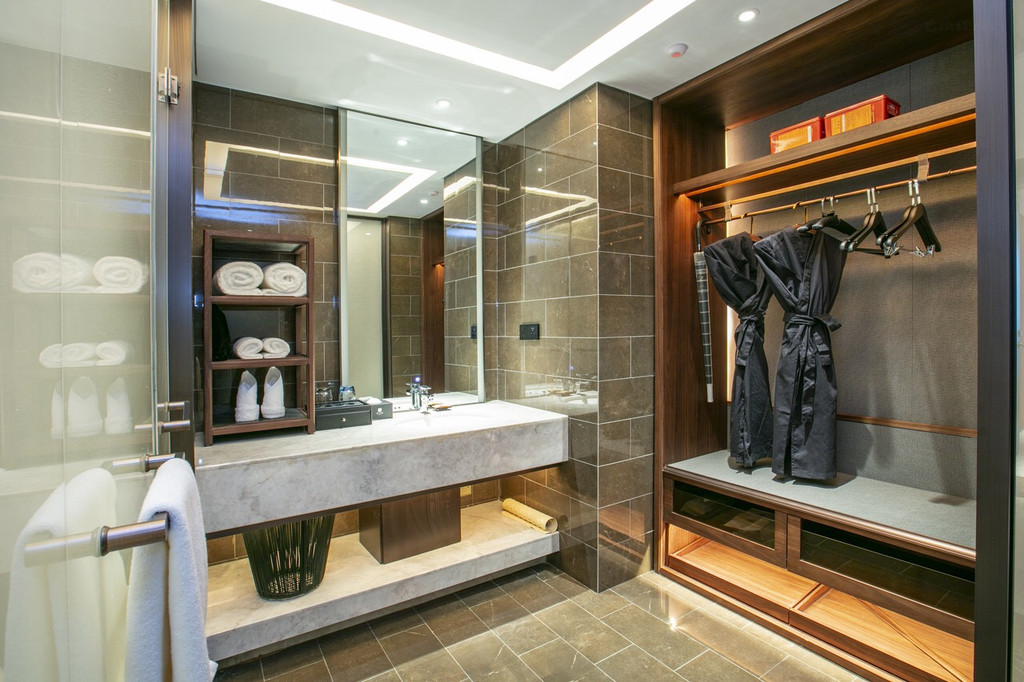 ③设施:房间和周边同类型酒店相比,很大,细节都值得推敲,不仅是床品的荞麦枕,鸭绒被,盥洗室的洗漱备品和电动马桶,桌子和电视机柜的石板触感太好了,不常见以这种材质做桌子,手感太棒了…房间标准也是按照高星酒店来的床品,拖鞋,浴室的毛巾和白苔的洗浴液,浴袍相当有质感。果盘给了品质很好的香蕉和苹果,mini吧两瓶水两听碳酸饮料免费饮用,房间一共给了6瓶水,2瓶依云,4瓶普利思,实力告诉你,咱不差水 哈哈~