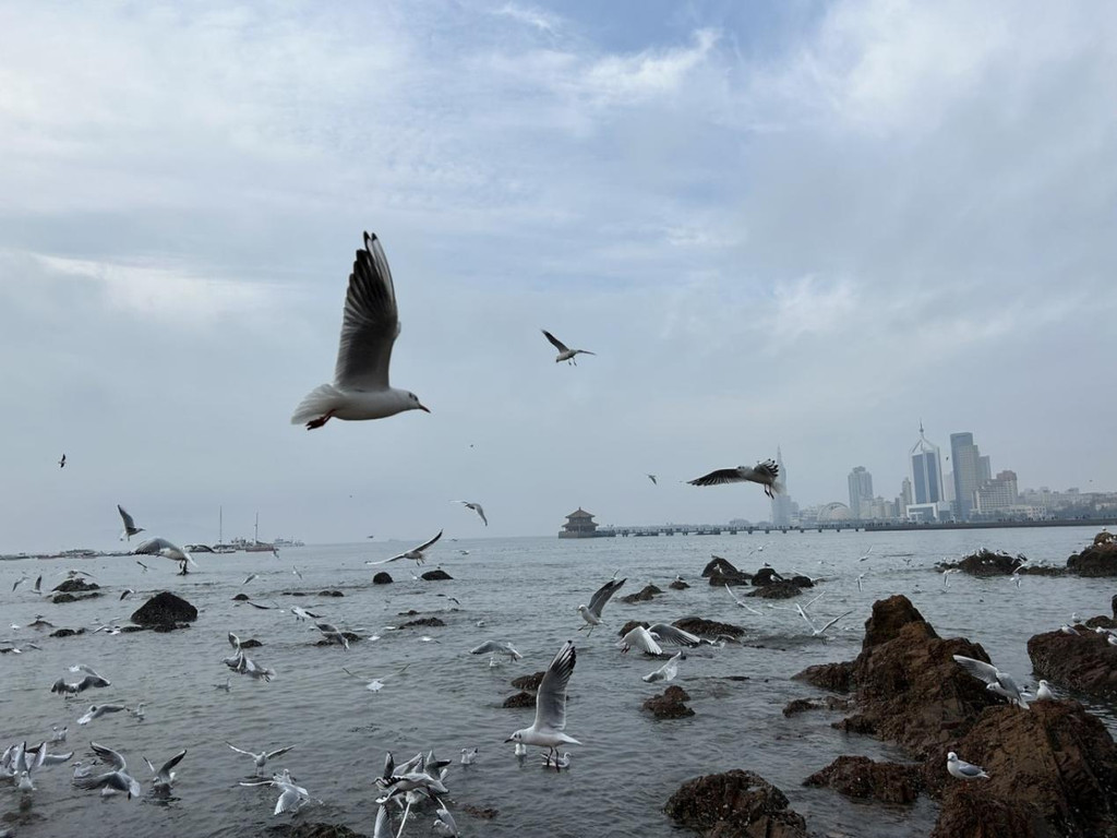 先说在栈桥。我们买了油条,专门过来喂海鸥。虽然大家准备的食物不一样,但是这里的海鸥确实最爱吃的就是油条了。而且,这些海鸥也不怕人,就这么随意地停在一边,甚至还能直接从游客手里叼过去油条。看来也是社交小达人啊。