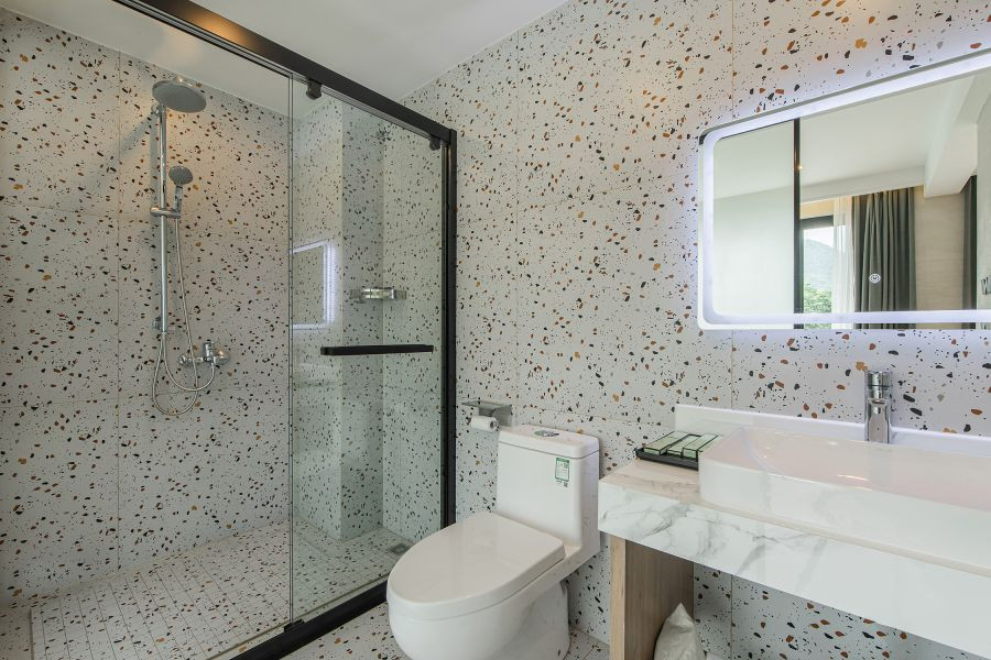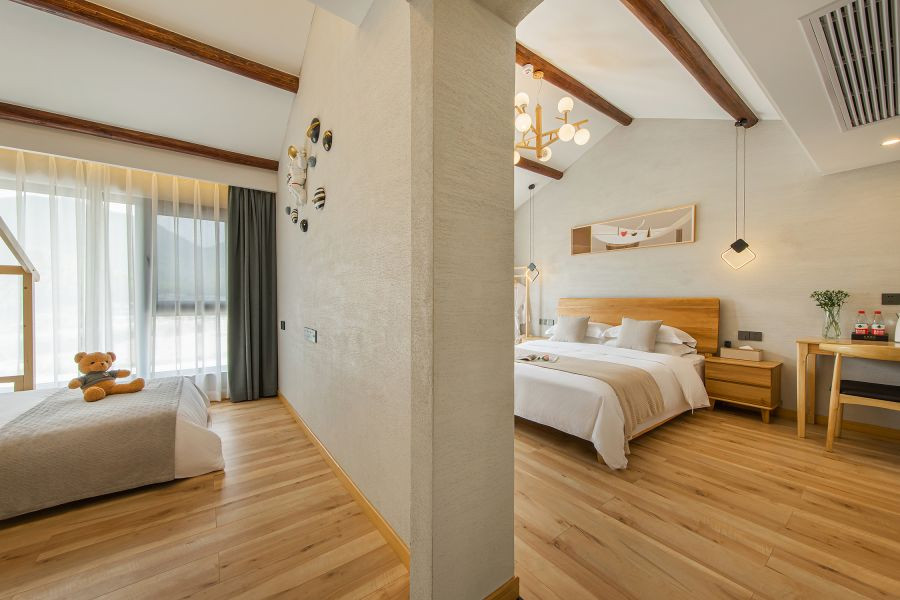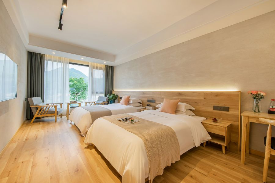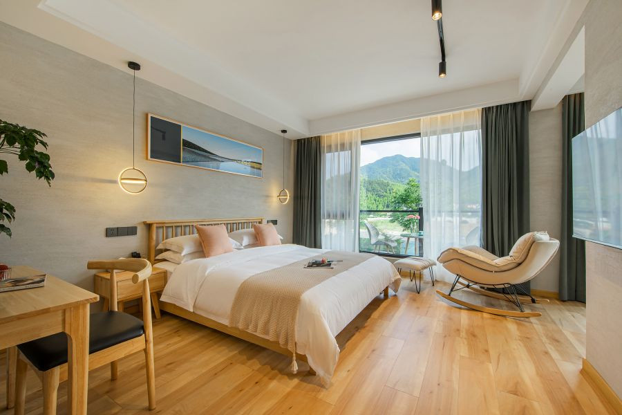 房间内都配备有齐全的现代化设施,整体设计风格轻奢简约,极具设计感的吊灯、原木风的家居摆件,每一件都摆放得恰到好处。宽大的落地窗设计,可以将远方的山川秋色一览无余,温馨的住宿环境定能尽享舒适。