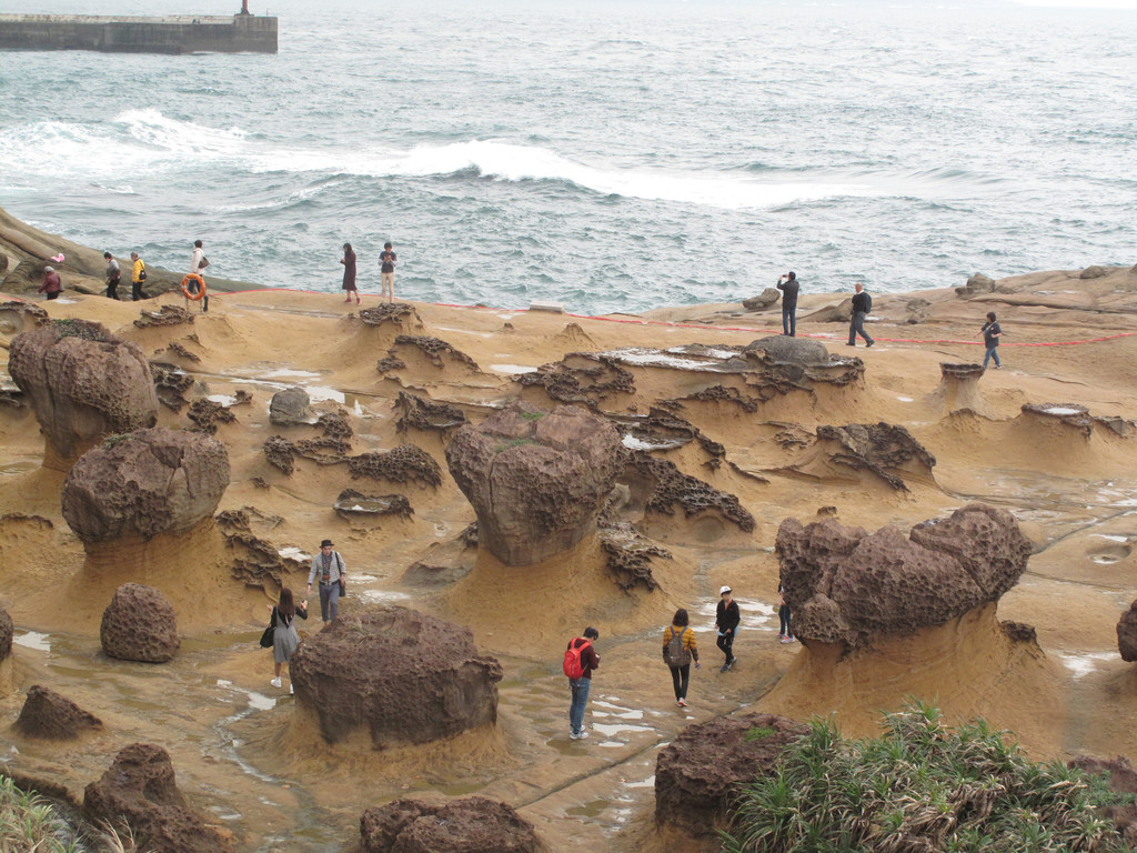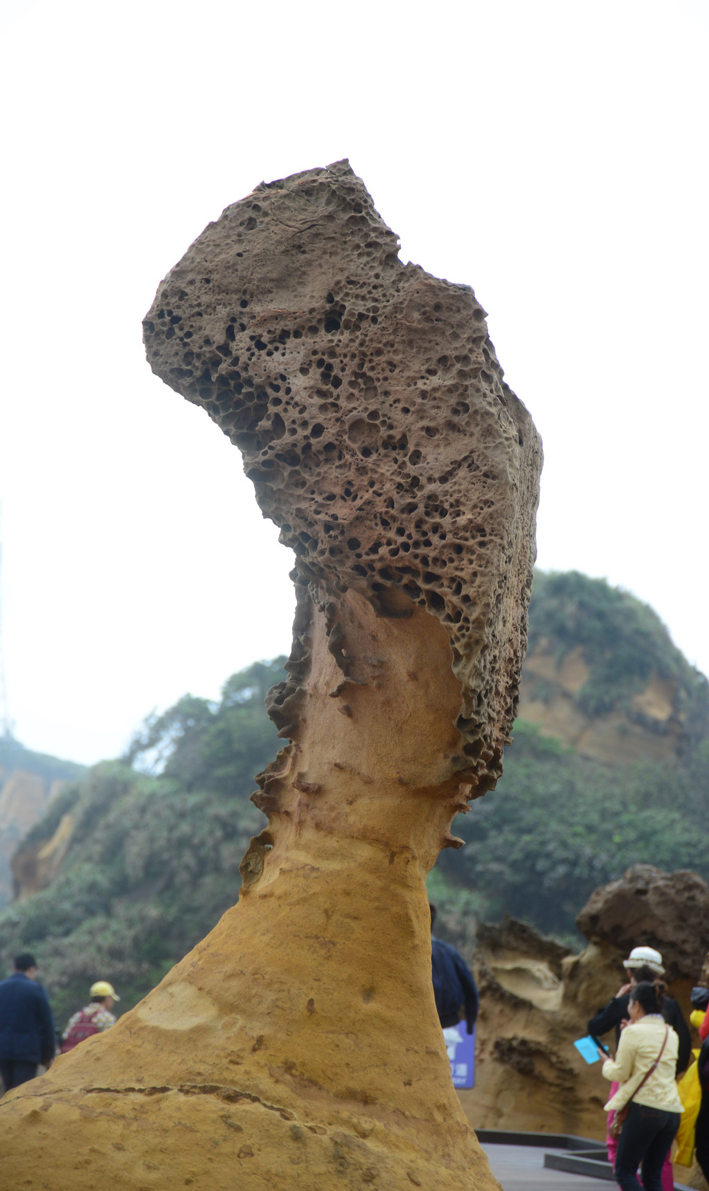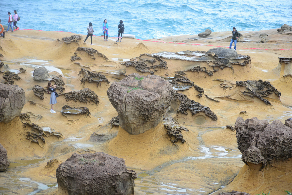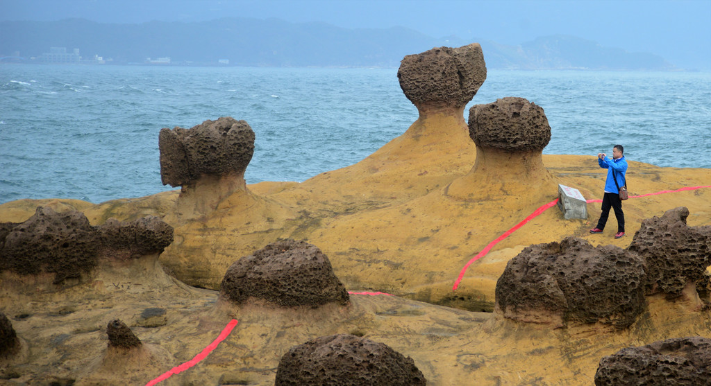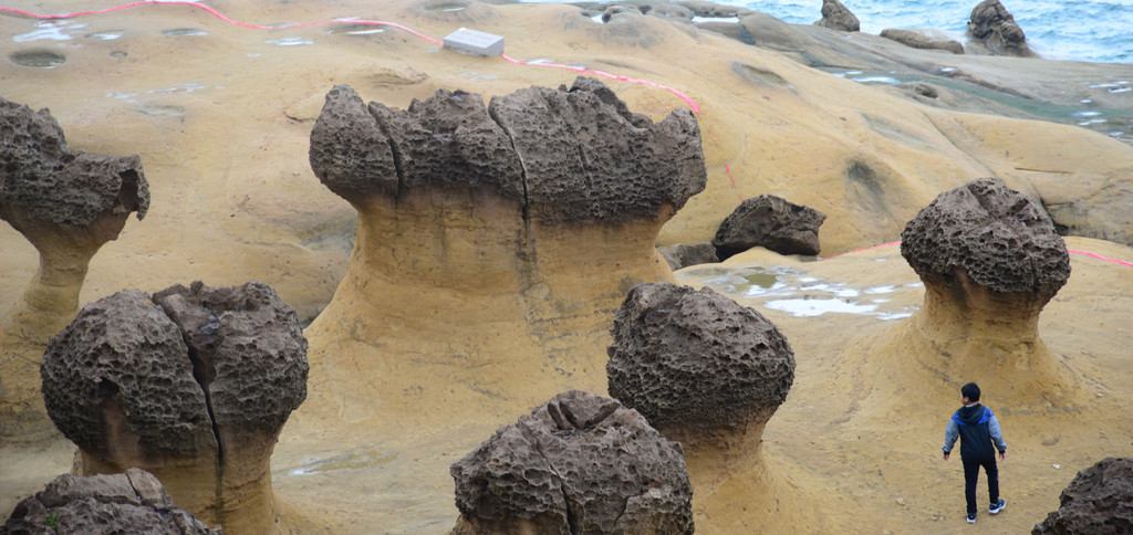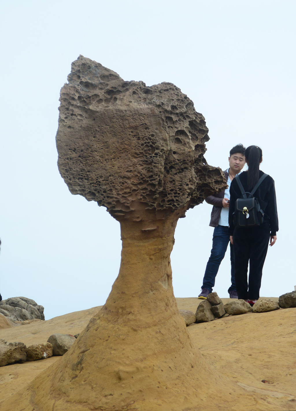 野柳地质公园位于新北市万里区(台北北面略偏东),突出于北海岸狭长的海岬上,长1700米。经过千百万年长期风吹浪打,风化侵蚀相互作用,山石逐渐演变成各种各样的形态。如“蕈状岩”“仙女鞋”“女王头”蔚为壮观给人震撼。