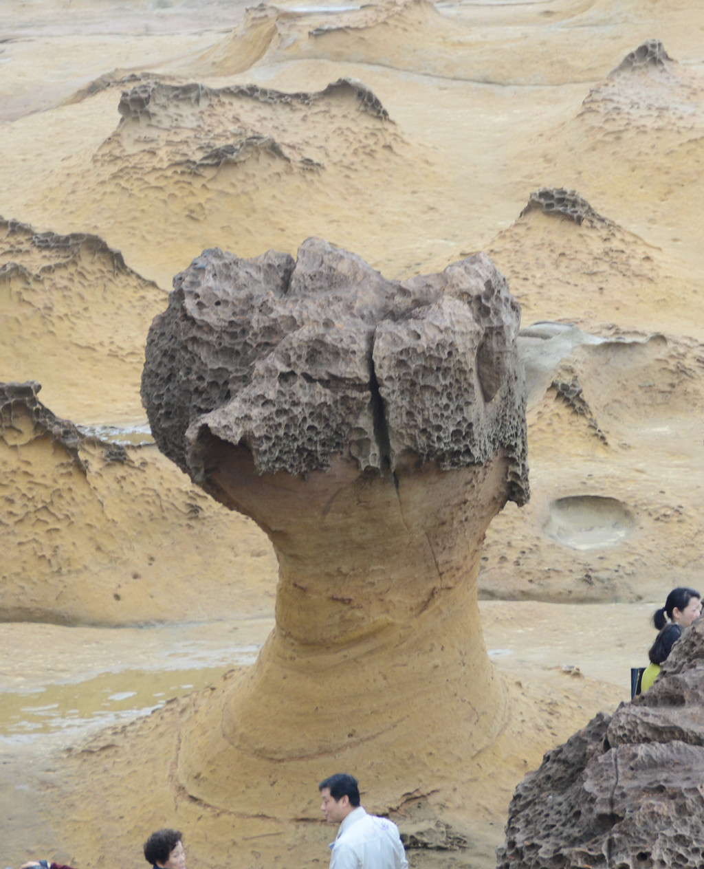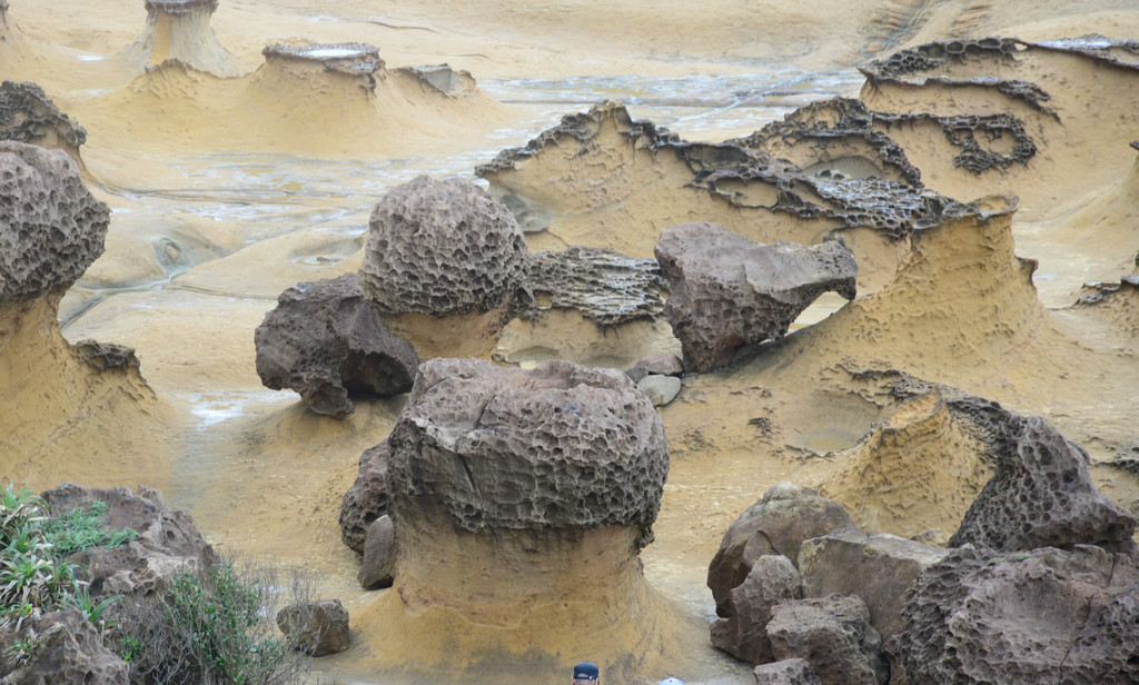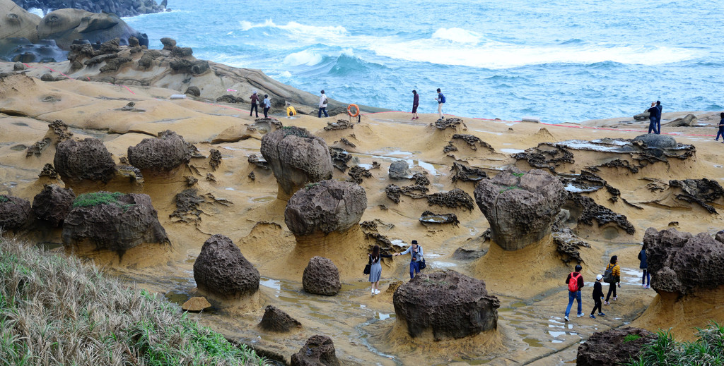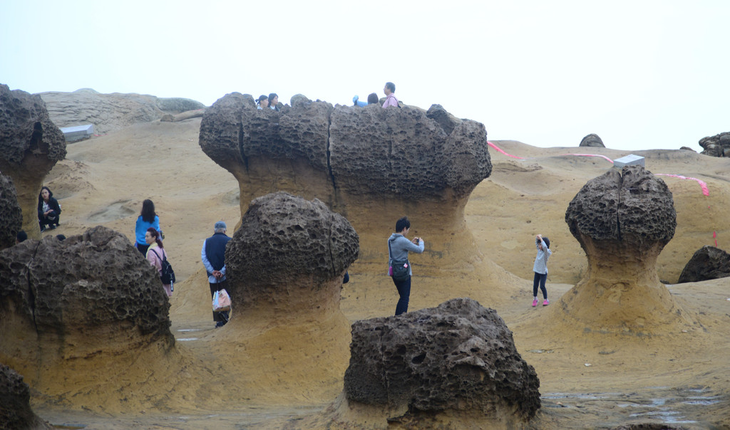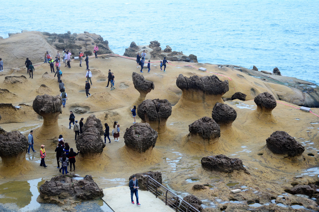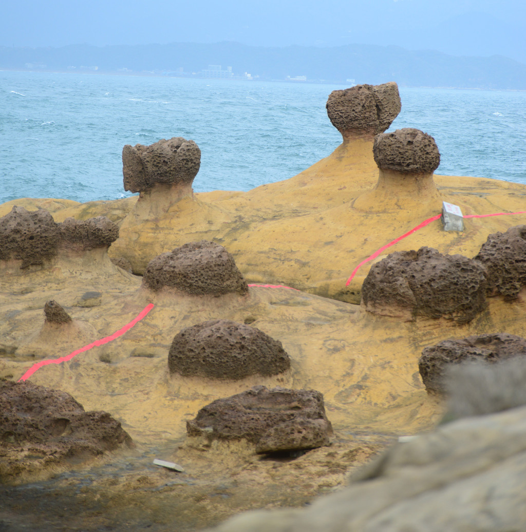 野柳地质公园位于新北市万里区(台北北面略偏东),突出于北海岸狭长的海岬上,长1700米。经过千百万年长期风吹浪打,风化侵蚀相互作用,山石逐渐演变成各种各样的形态。如“蕈状岩”“仙女鞋”“女王头”蔚为壮观给人震撼。