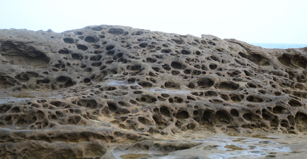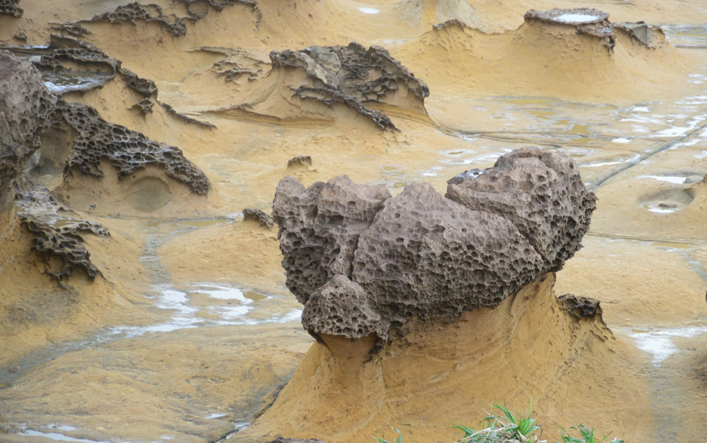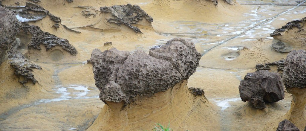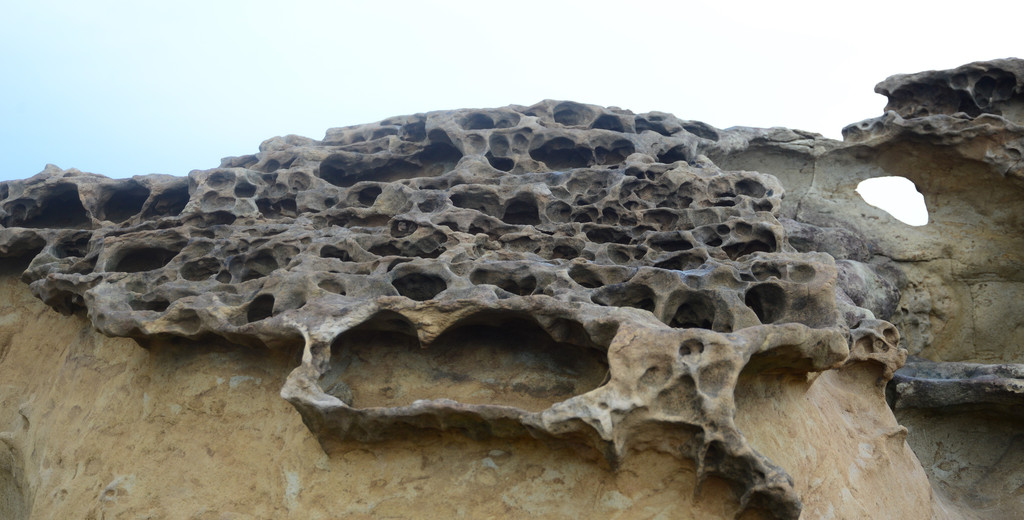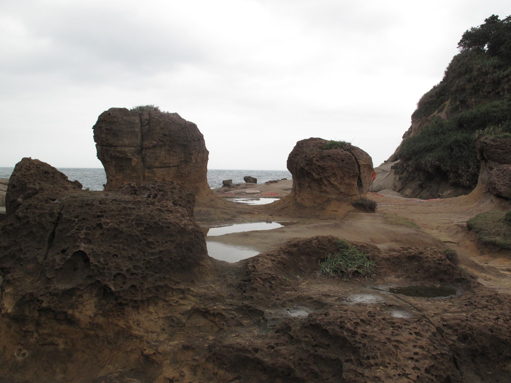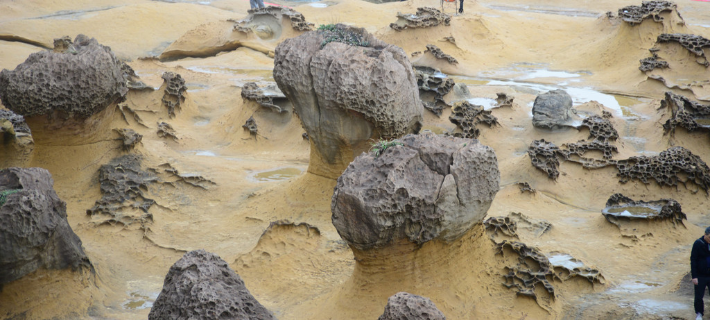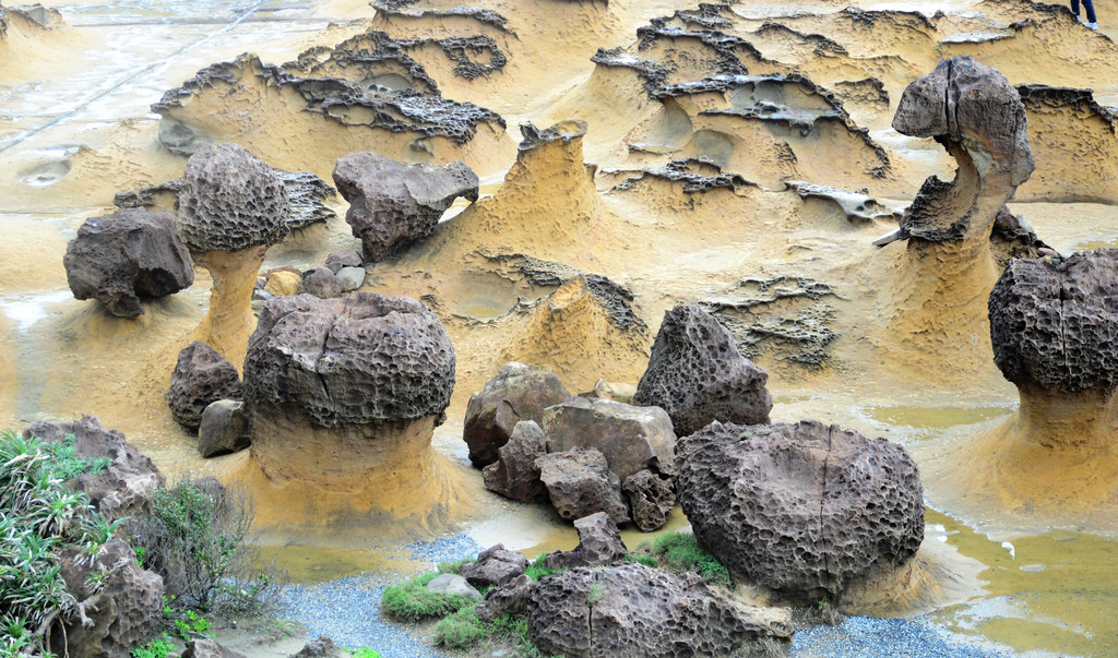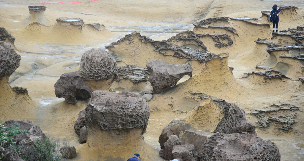 野柳地质公园位于新北市万里区(台北北面略偏东),突出于北海岸狭长的海岬上,长1700米。经过千百万年长期风吹浪打,风化侵蚀相互作用,山石逐渐演变成各种各样的形态。如“蕈状岩”“仙女鞋”“女王头”蔚为壮观给人震撼。